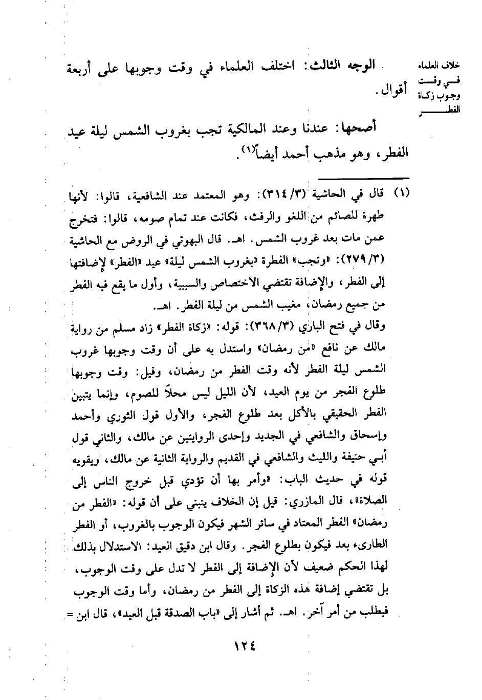 وقال في فتح الباري (3/ 368): قوله: "زكاة الفطر" زاد مسلم من رواية مالك عن نافع "من رمضان" واستدل به على أن وقت وجوبها غروب الشمس ليلة الفطر لأنه وقت الفطر من رمضان، وقيل: وقت وجوبها طلوع الفجر من يوم العيد، لأن الليل ليس محلاً للصوم، وإنما يتبين الفطر الحقيقي بالأكل بعد طلوع الفجر، والأول قول الثوري وأحمد وإسحاق والشافعي في الجديد وإحدى الروايتين عن مالك، والثاني قول أبي حنيفة والليث والشافعي في القديم والرواية الثانية عن مالك، ويقويه قوله في حديث الباب: "وأمر بها أن تؤدي قبل خروج الناس إلى الصلاة"، قال المازري: قيل إن الخلاف ينبني على أن قوله: "الفطر من رمضان" الفطر المعتاد في سائر الشهر فيكون الوجوب بالغروب، أو الفطر الطارىء بعد فيكون بطلوع الفجر. وقال ابن دقيق العيد: الاستدلال بذلك لهذا الحكم ضعيف لأن الإِضافة إلى الفطر لا تدل على وقت الوجوب، بل تقتضي إضافة هذه الزكاة إلى الفطر من رمضان، وأما وقت الوجوب فيطلب من أمر آخر. اهـ. ثم أشار إلى "باب الصدقة قبل العيد"، قال ابن =