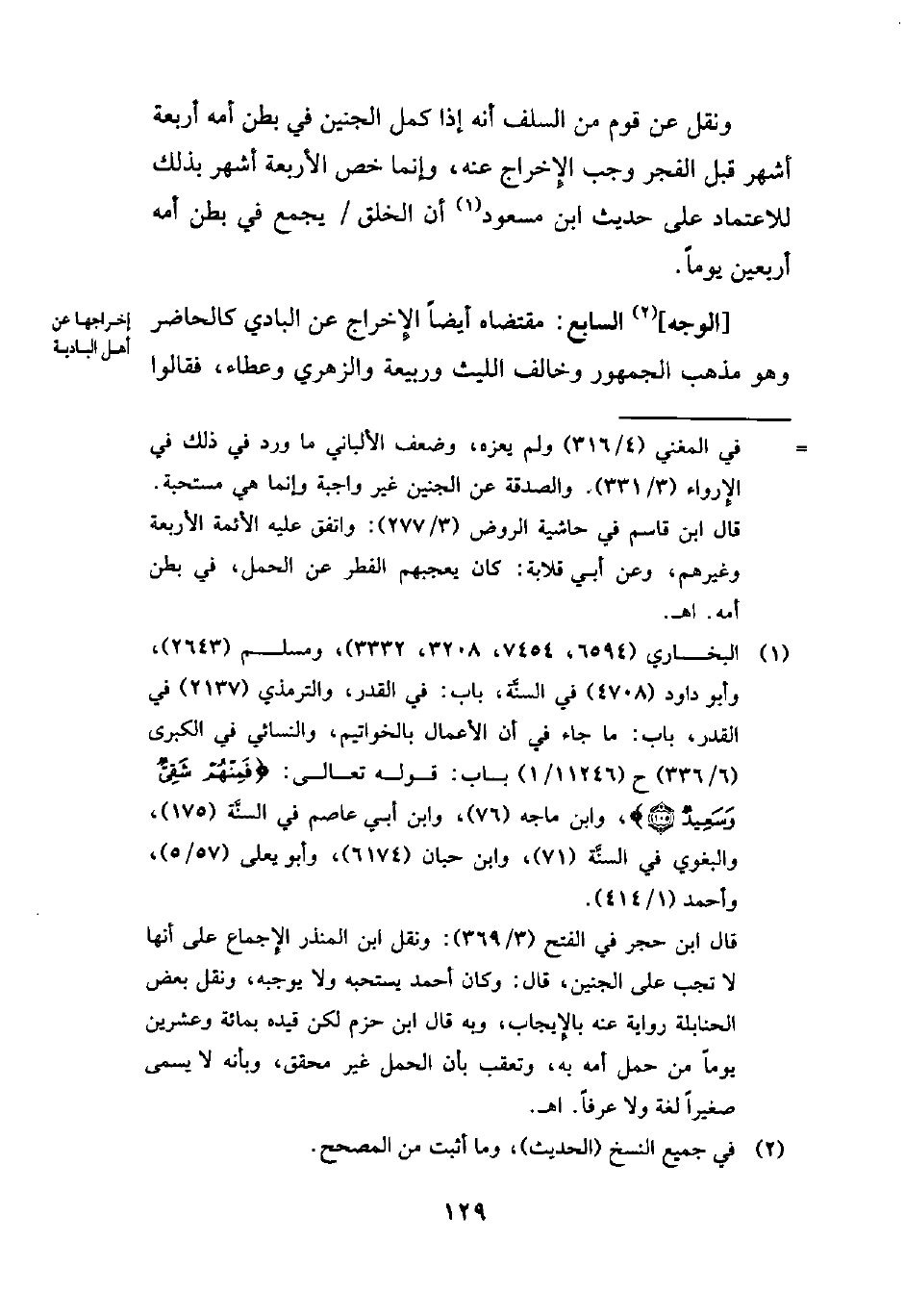 ونقل عن قوم من السلف أنه إذا كمل الجنين في بطن أمه أربعة أشهر قبل الفجر وجب الإِخراج عنه، وإنما خص الأربعة أشهر بذلك للاعتماد على حديث ابن مسعود (¬1) أن الخلق يجمع في بطن أمه أربعين يوماً.