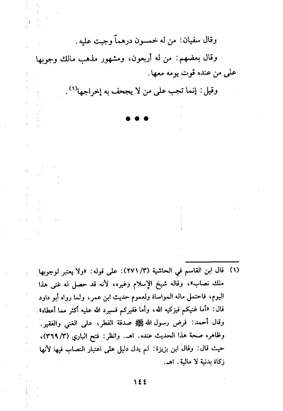 (¬1) قال ابن القاسم في الحاشية (3/ 271): على قوله: "ولا يعتر لوجوبها ملك نصاب", وقاله شيخ الإِسلام وغيره، لأنه قد حصل له غنى هذا اليوم، فاحتمل ماله المواساة ولعموم حديث ابن عمر، ولما رواه أبو داود قال: "أما غنيكم فيزكيه الله، وأما فقيركم فسيرد الله عليه أكثر مما أعطاه" وقال أحمد: فرض رسول الله - صلى الله عليه وسلم - صدقة الفطر، على الغني والفقير.