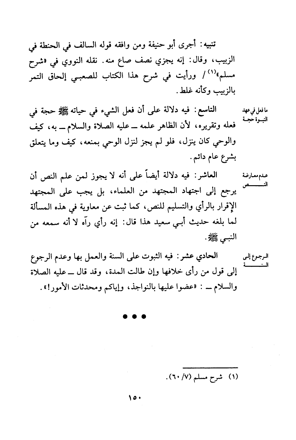 العاشر: فيه دلالة أيضًا على أنه لا يجوز لمن علم النص أن يرجع إلى اجتهاد المجتهد من العلماء، بل يجب على المجتهد الإِقرار بالرأي والتسليم للنص، كما ثبت عن معاوية في هذه المسألة لما بلغه حديث أبي سعيد هذا قال: إنه رأي رآه لا أنه سمعه من النبي - صلى الله عليه وسلم -.