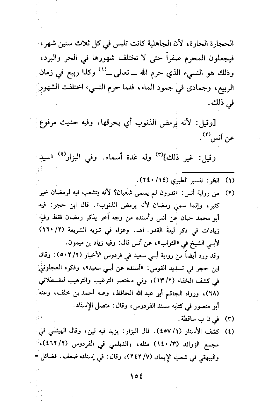 الحجارة الحارة، لأن الجاهلية كانت تلبس في كل ثلاث سنين شهر، فيجعلون المحرم صفراً حتى لا تختلف شهورها في الحر والبرد، وذلك هو النسيء الذي حرم الله -تعالى- (¬1) وكذا ربيع في زمان الربيع، وجمادى في جمود الماء، فلما حرم النسيء اختلفت المشهور في ذلك.