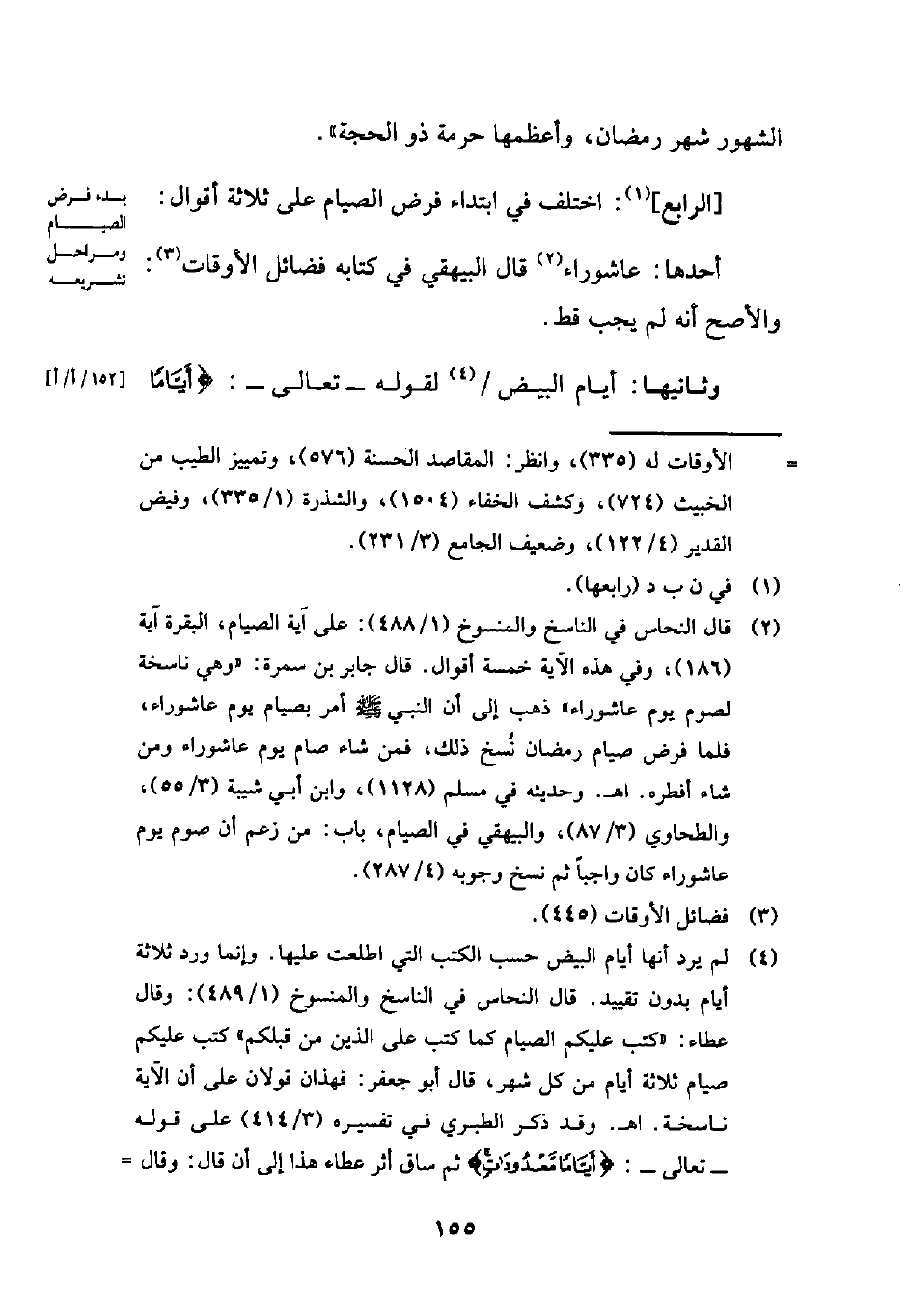 (¬4) لم يرد أنها أيام البيض حسب الكتب الي اطلعت عليها. وإنما ورد ثلاثة أيام بدون تقييد. قال النحاس في الناسخ والمنسوخ (1/ 489): وقال عطاء: "كتب عليكم الصيام كما كتب على الذين من قبلكم" كتب عليكم صيام ثلاثة أيام من كل شهر، قال أبو جعفر: فهذان قولان على أن الآية ناسخة. اهـ. وقد ذكر الطبري في تفسيره (3/ 414) على قوله -تعالى-: {أَيَّامًا مَعْدُودَاتٍ} ثم ساق أثر عطاء هذا إلى أن قال: وقال =