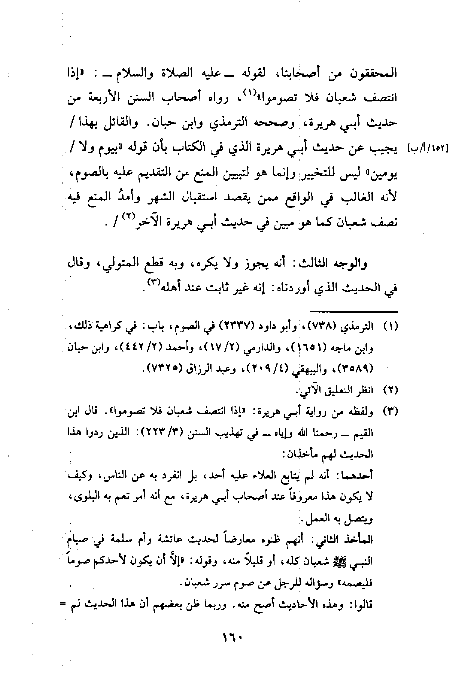 (¬3) ولفظه من رواية أبي هريرة: "إذا انتصف شعبان فلا تصوموا". قال ابن القيم -رحمنا الله وإياه- في تهذيب السنن (3/ 223): الذين ردوا هذا الحديث لهم مأخذان: