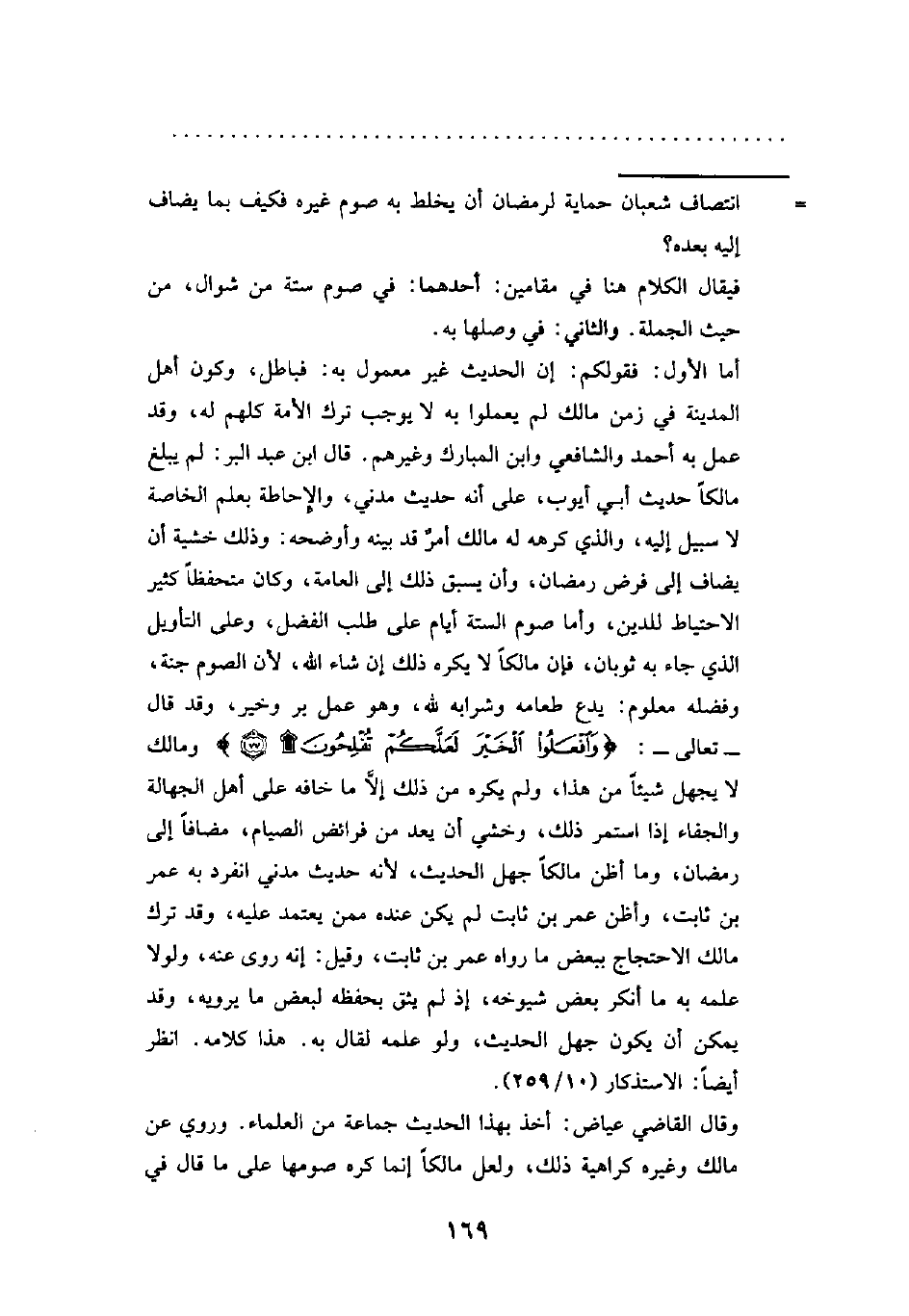 أما الأول: فقولكم: إن الحديث غير معمول به: فباطل، وكون أهل المدينة في زمن مالك لم يعملوا به لا يوجب ترك الأمة كلهم له، وقد عمل به أحمد والشافعي وابن المبارك وغيرهم. قال ابن عبد البر: لم يبلغ مالكاً حديث أبي أيوب، على أنه حديث مدني، والإِحاطة بعلم الخاصة لا سبيل إليه، والذي كرهه له مالك أمرٌ قد بينه وأوضحه: وذلك خشية أن يضاف إلى فرض رمضان, وأن يسبق ذلك إلى العامة، وكان متحفظاً كثير الاحتياط للدين، وأما صوم الستة أيام على طلب الفضل، وعلى التأويل الذي جاء به ثوبان، فإن مالكاً لا يكره ذلك إن شاء الله، لأن الصوم جنة، وفضله معلوم: يدع طعامه وشرابه لله، وهو عمل بر وخير، وقد قال -تعالى-: {وَافْعَلُوا الْخَيْرَ لَعَلَّكُمْ تُفْلِحُونَ (77)} ومالك لا يجهل شيئاً من هذا, ولم يكره من ذلك إلَّا ما خافه على أهل الجهالة والجفاء إذا استمر ذلك، وخشي أن يعد من فرائض الصيام، مضافاً إلى رمضان، وما أظن مالكاً جهل الحديث، لأنه حديث مدني انفرد به عمر بن ثابت، وأظن عمر بن ثابت لم يكن عنده ممن يعتمد عليه، وقد ترك مالك الاحتجاج ببعض ما رواه عمر بن ثابت, وقيل: إنه روى عنه، ولولا علمه به ما أنكر بعض شيوخه، إذ لم يثق بحفظه لبعض ما يرويه، وقد يمكن أن يكون جهل الحديث، ولو علمه لقال به. هذا كلامه. انظر أيضاً: الاستذكار (10/ 259).