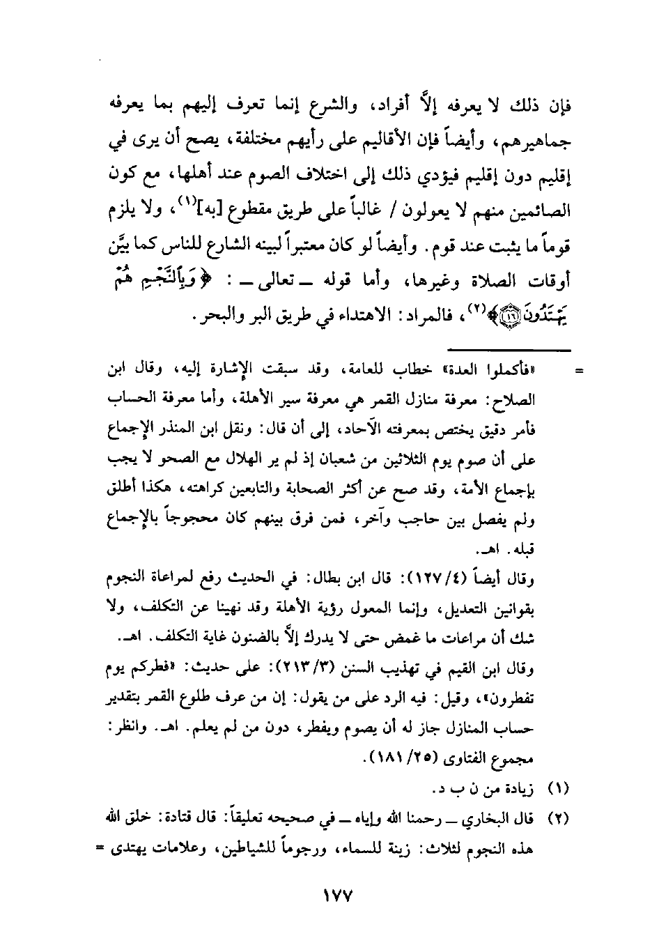 وقال أيضاً (4/ 127): قال ابن بطال: في الحديث رفع لمراعاة النجوم بقوانين التعديل، وإنما المعول رؤية الأهلة وقد نهينا عن التكلف، ولا شك أن مراعات ما غمض حتى لا يدرك إلَّا بالضنون غاية التكلف. اهـ.