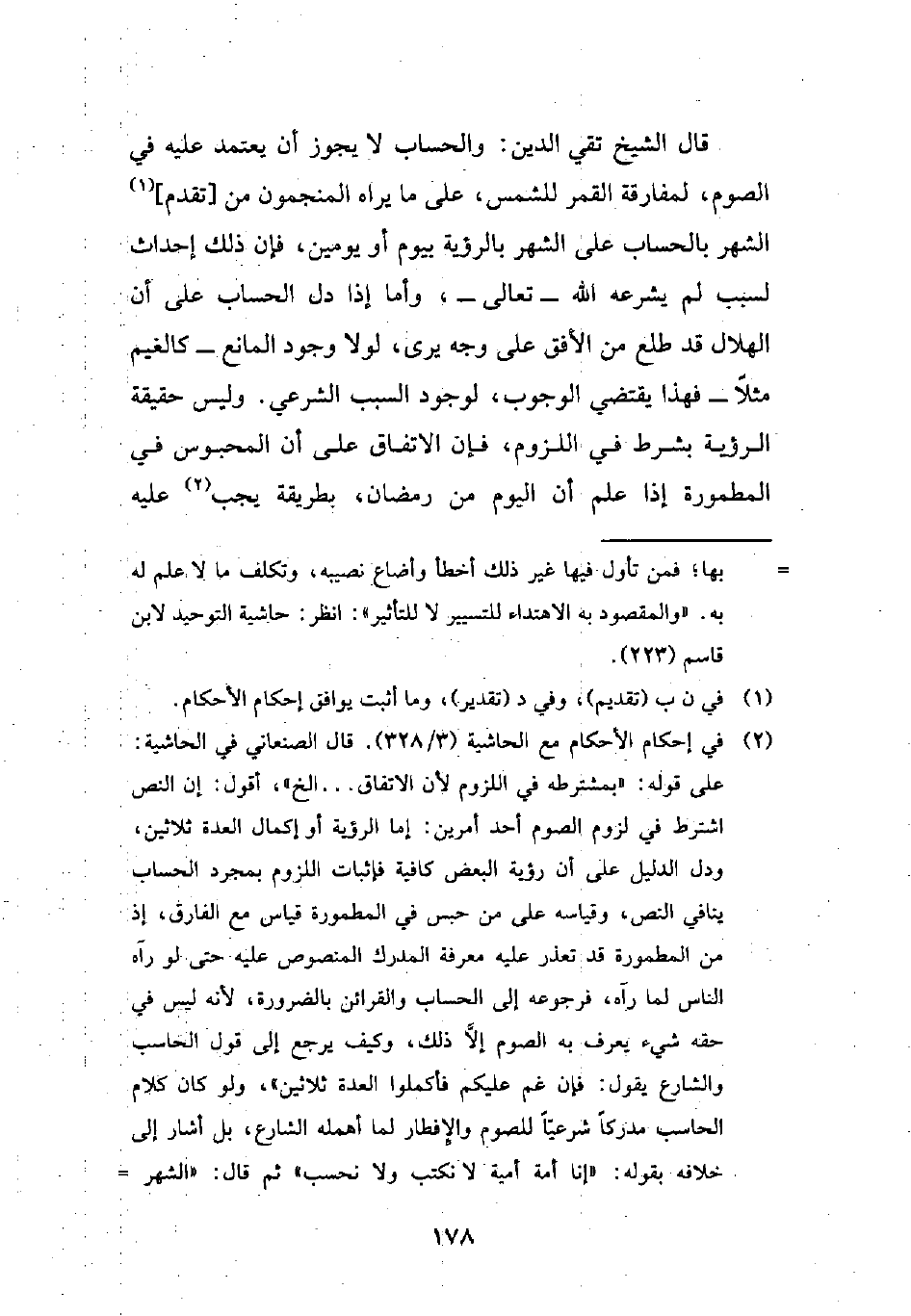 (¬2) في إحكام الأحكام مع الحاشية (3/ 328). قال الصنعاني في الحاشية: على قوله: "بمشترطه في اللزوم لأن الاتفاق ... إلخ"، أقول: إن النص اشترط في لزوم الصوم أحد أمرين: إما الرؤية أو إكمال العدة ثلاثين، ودل الدليل على أن رؤية البعض كافية فإثبات اللزوم بمجرد الحساب ينافي النص، وقياسه على من حبس في المطمورة قياس مع الفارق، إذ من المطمورة قد تعذر عليه معرفة المدرك المنصوص عليه حتى لو رآه الناس لما رآه، فرجوعه إلى الحساب والقرائن بالضرورة، لأنه ليس في حقه شيء يعرف به الصوم إلَّا ذلك، وكيف يرجع إلى قول الحاسب والشارع يقول: "فإن غم عليكم فأكملوا العدة ثلاثين"، ولو كان كلام الحاسب مدركاً شرعياً للصوم والإِفطار لما أهمله الشارع، بل أشار إلى خلافه بقوله: "إنا أمة أمية لا نكتب ولا نحسب" ثم قال: "الشهر =