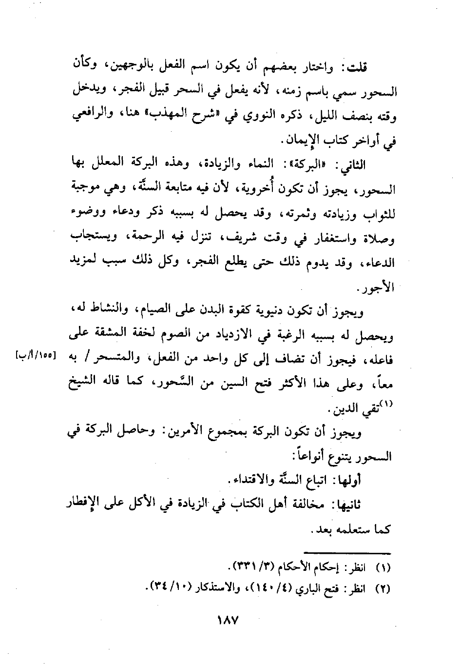 الثاني: "البركة": النماء والزيادة، وهذه البركة المعلل بها السحور، يجوز أن تكون أُخروية، لأن فيه متابعة السنَّة، وهي موجبة للثواب وزيادته وثمرته، وقد يحصل له بسببه ذكر ودعاء ووضوء وصلاة واستغفار في وقت شريف، تنزل فيه الرحمة، ويستجاب الدعاء، وقد يدوم ذلك حتى يطلع الفجر، وكل ذلك سبب لمزيد الأجور.