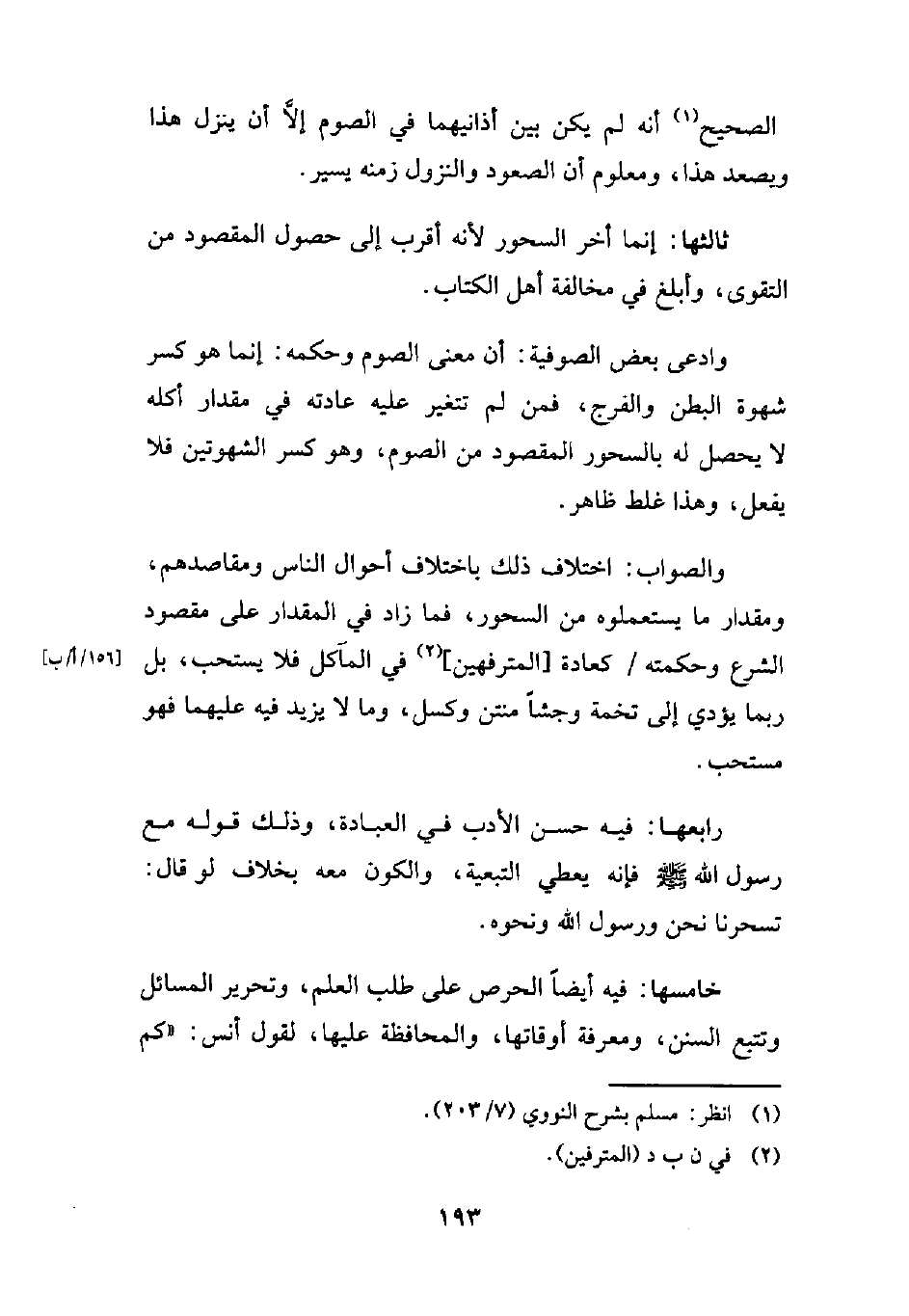 والصواب: اختلاف ذلك باختلاف أحوال الناس ومقاصدهم، ومقدار ما يستعملوه من السحور، فما زاد في المقدار على مقصود الشرع وحكمته كعادة [المترفهين] (¬2) في المآكل فلا يستحب، بل ربما يؤدي إلى تخمة وجشاً منتن وكسل، وما لا يزيد فيه عليهما فهو مستحب.