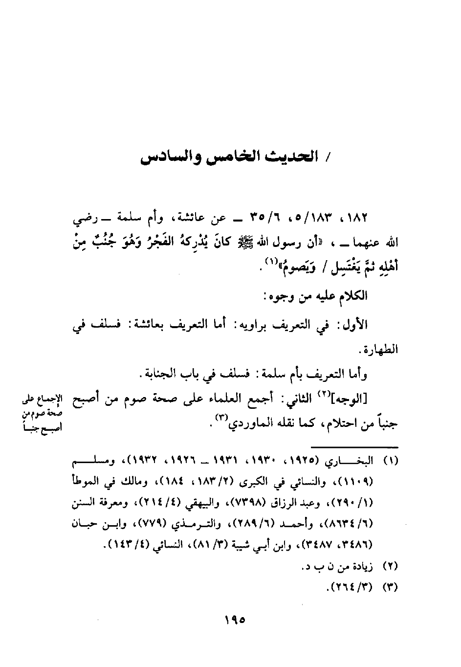 182، 183/ 5، 6/ 35 - عن عائشة، وأم سلمة -رضي الله عنهما-، "أن رسول الله - صلى الله عليه وسلم - كانَ يُدْرِكهُ الفَجْرُ وَهُوَ جُنُبٌ مِنْ أهْلِهِ ثمَّ يَغْتَسِل وَيَصومُ" (¬1).