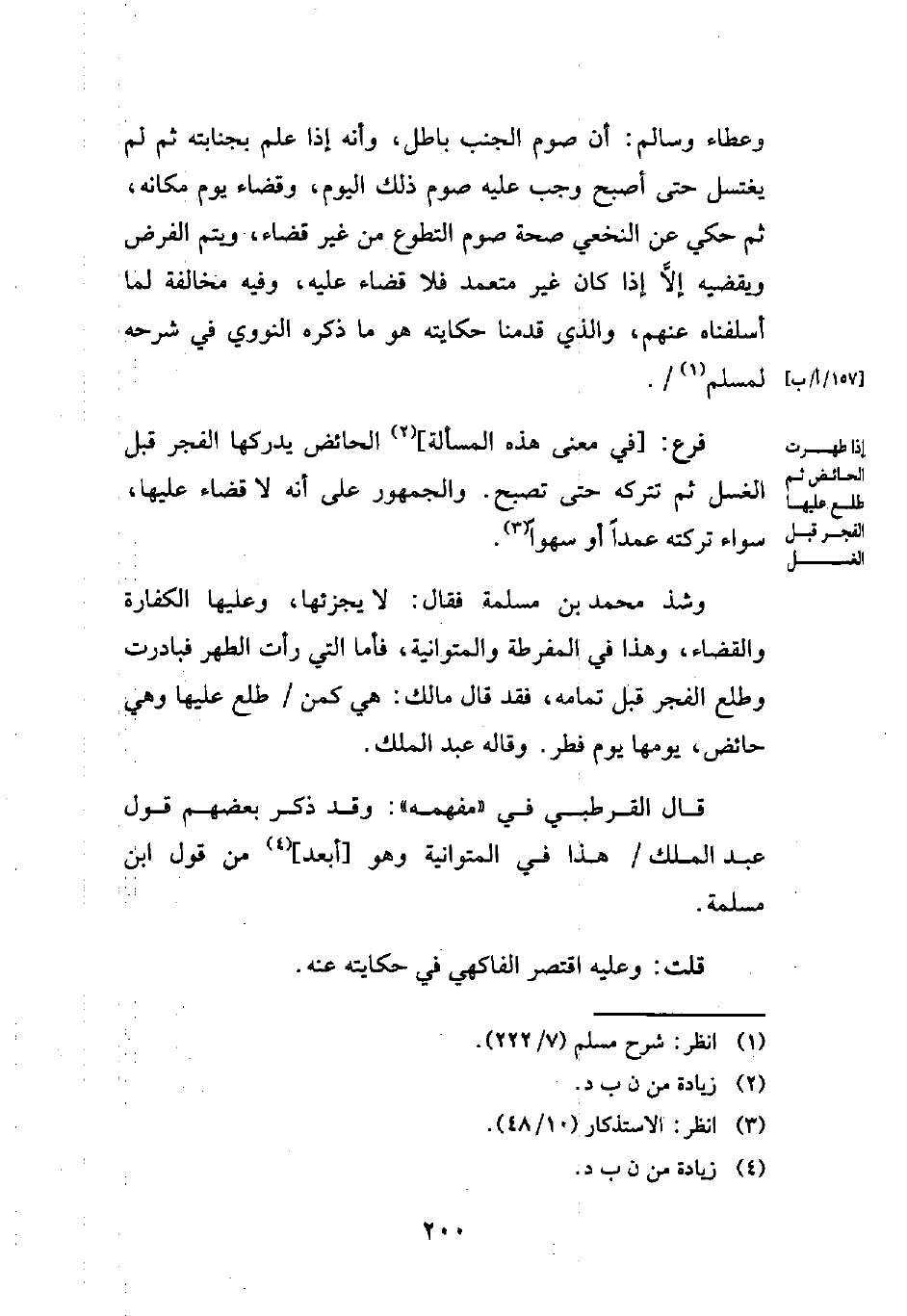 وشذ محمد بن مسلمة فقال: لا يجزئها، وعليها الكفارة والقضاء، وهذا في المفرطة والمتوانية، فأما التي رأت الطهر فبادرت وطلع الفجر قبل تمامه، فقد قال مالك: هي كمن طلع عليها وهي حائض، يومها يوم فطر. وقاله عبد الملك.
