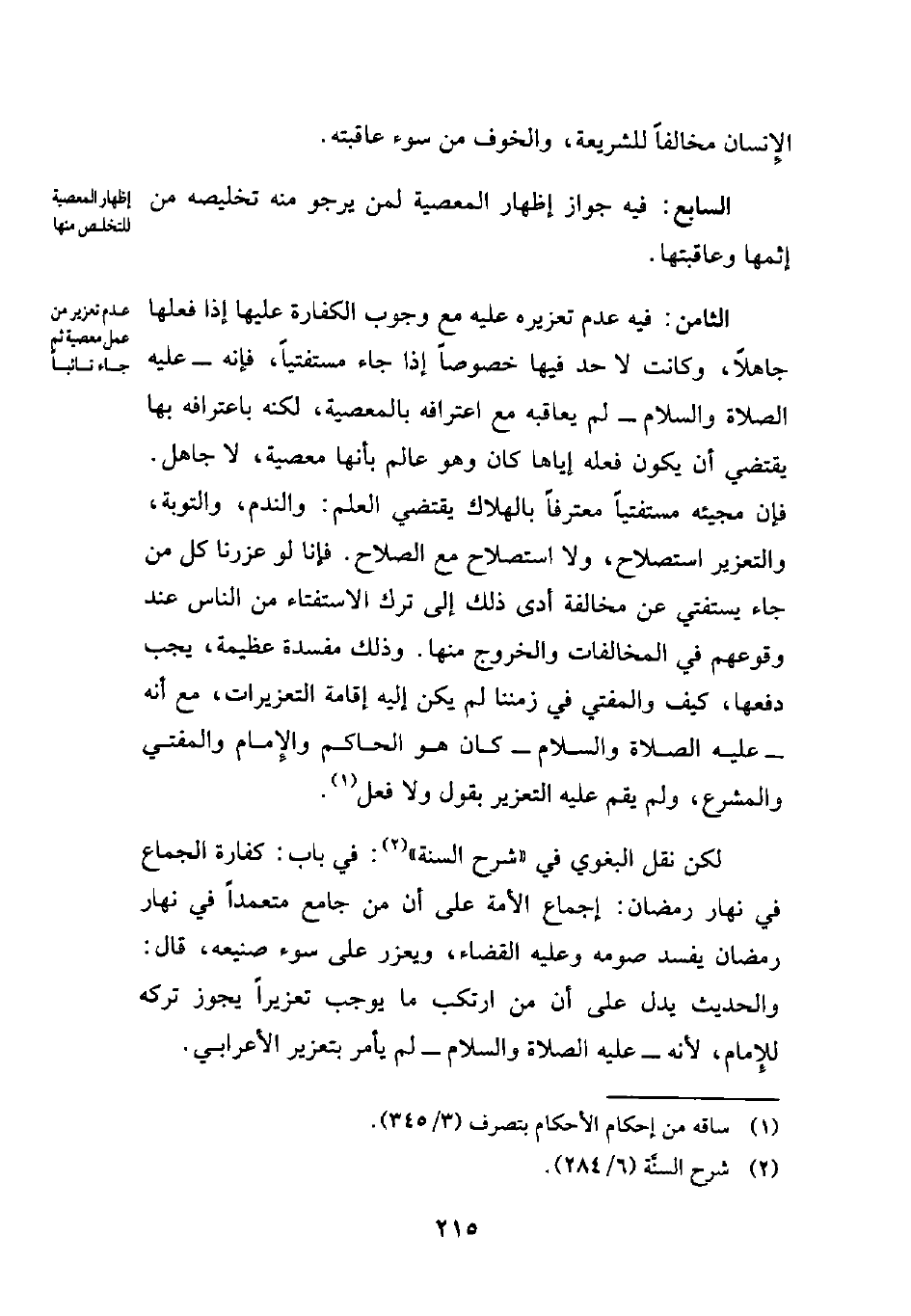الثامن: فيه عدم تعزيره عليه مع وجوب الكفارة عليها إذا فعلها جاهلاً، وكانت لا حد فيها خصوصاً إذا جاء مستفتياً، فإنه -عليه الصلاة والسلام- لم يعاقبه مع اعترافه بالمعصية، لكنه باعترافه بها يقتضي أن يكون فعله إياها كان وهو عالم بأنها معصية، لا جاهل. فإن مجيئه مستفتياً معترفاً بالهلاك يقتضي العلم: والندم، والتوبة، والتعزير استصلاح، ولا استصلاح مع الصلاح. فإنا لو عزرنا كل من جاء يستفتي عن مخالفة أدى ذلك إلى ترك الاستفتاء من الناس عند وقوعهم في المخالفات والخروج منها. وذلك مفسدة عظيمة، يجب دفعها، كيف والمفتي في زمننا لم يكن إليه إقامة التعزيرات، مع أنه -عليه الصلاة والسلام- كان هو الحاكم والإِمام والمفتي والمشرع، ولم يقم عليه التعزير بقول ولا فعل (¬1).