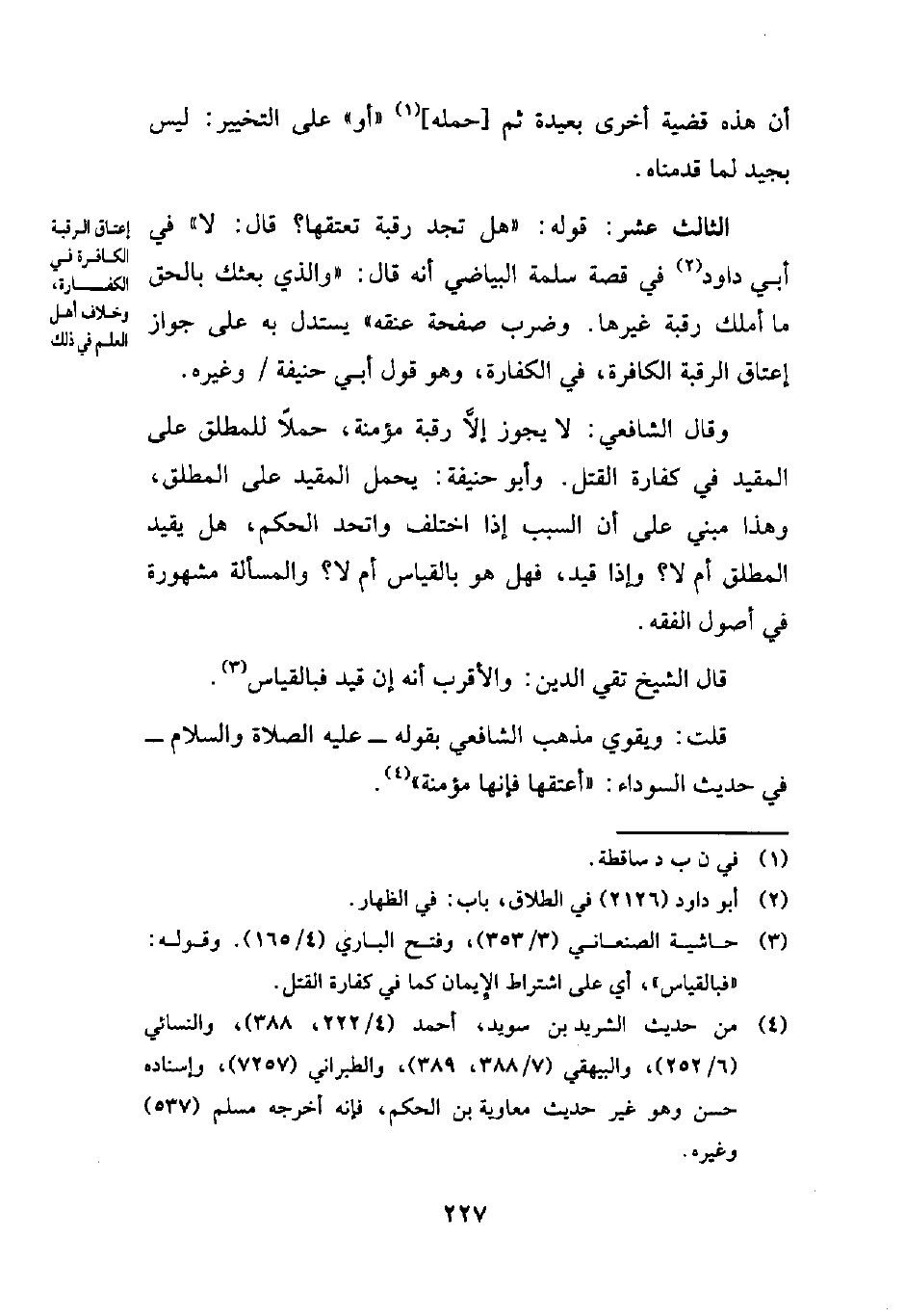 (¬3) حاشية الصنعاني (3/ 353)، وفتح الباري (4/ 165). وقوله: "فبالقياس"، أي على اشتراط الإِيمان كما في كفارة القتل.