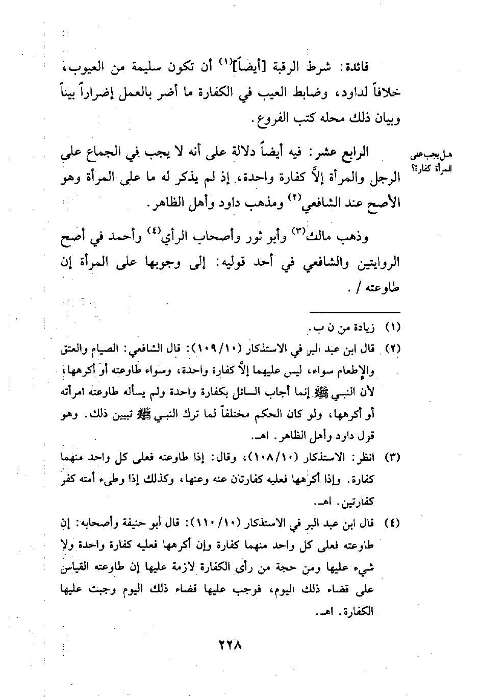 (¬4) قال ابن عبد البر في الاستذكار (10/ 110): قال أبو حنيفة وأصحابه: إن طاوعته فعلى كل واحد منهما كفارة وإن أكرهها فعليه كفارة واحدة ولا شيء عليها ومن حجة من رأى الكفارة لازمة عليها إن طاوعته القياس على قضاه ذلك اليوم، فوجب عليها قضاء ذلك اليوم وجبت عليها الكفارة. اهـ.
