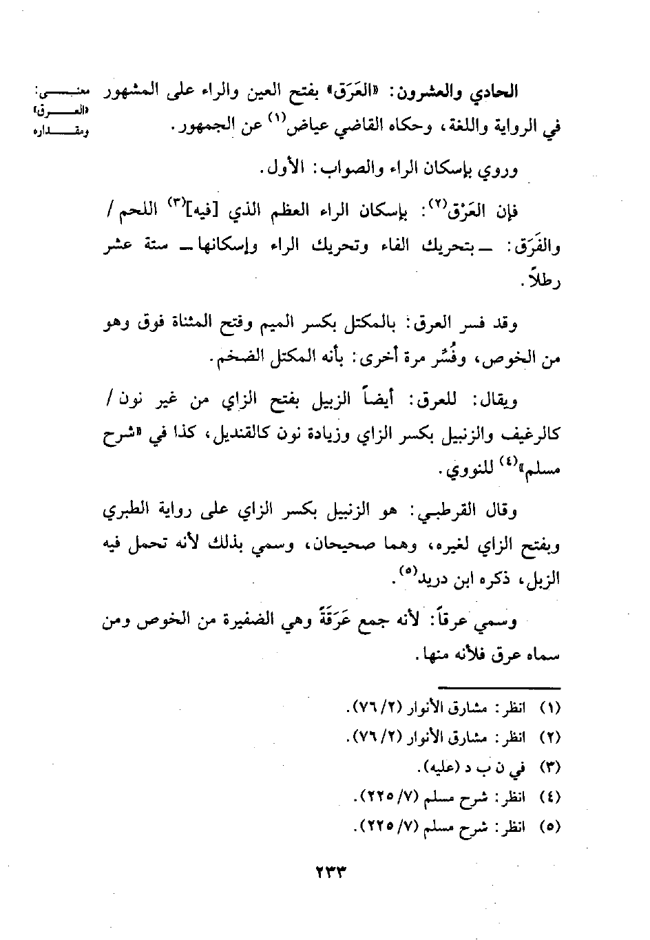 الحادي والعشرون: "العَرَق" بفتح العين والراء على المشهور في الرواية واللغة، وحكاه القاضي عياض (¬1) عن الجمهور.