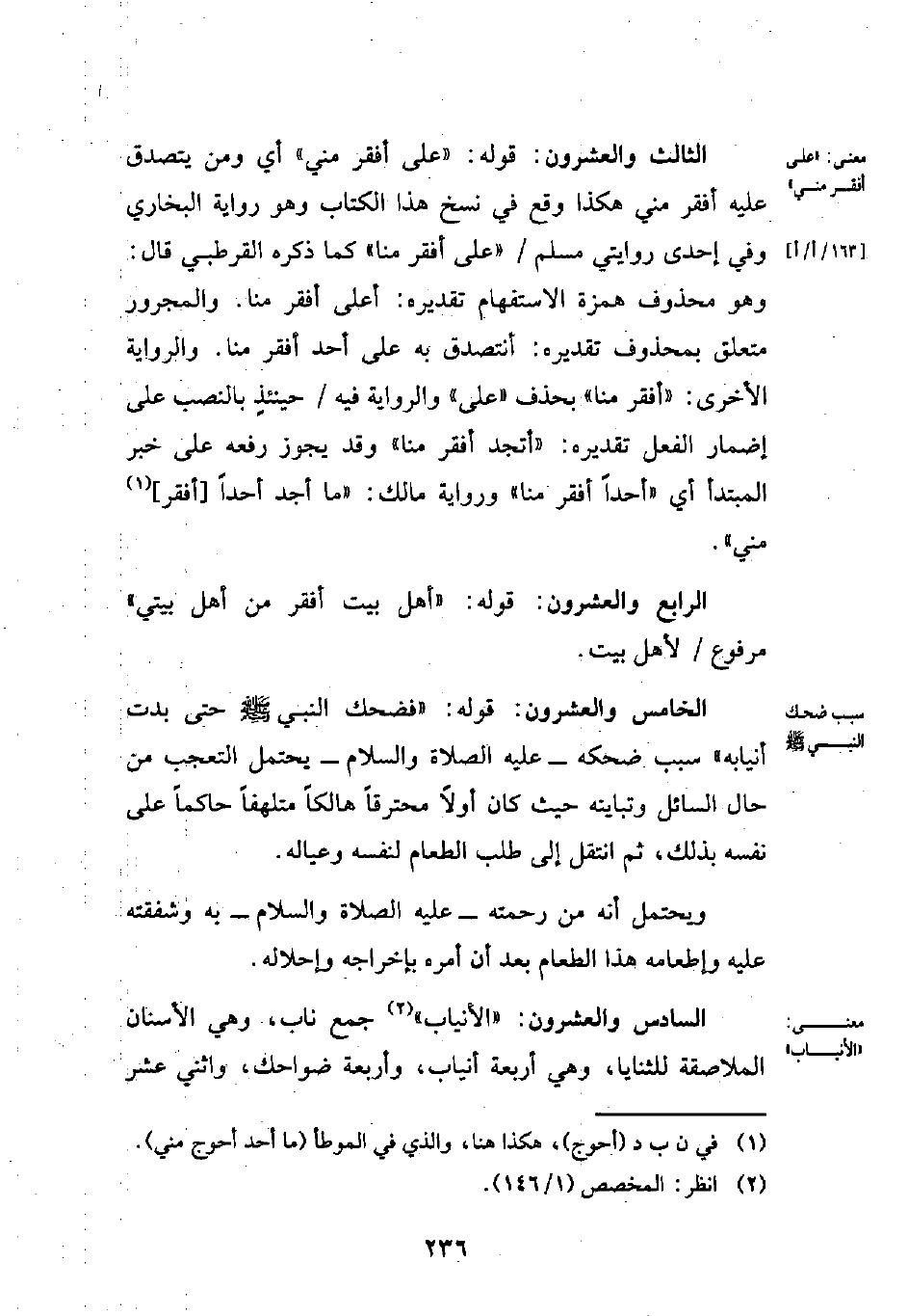 الثالث والعشرون: قوله: "على أفقر مني" أي ومن يتصدق عليه أفقر مني هكذا وقع في نسخ هذا الكتاب وهو رواية البخاري وفي إحدى روايتي مسلم "على أفقر منا" كما ذكره القرطبي قال: وهو محذوف همزة الاستفهام تقديره: أعلى أفقر منا. والمجرور متعلق بمحذوف تقديره: أنتصدق به على أحد أفقر منا. والرواية الأخرى: "أفقر منا" بحذف "على" والرواية فيه حينئذٍ بالنصب على إضمار الفعل تقديره: "أتجد أففر منا" وقد يجوز رفعه على خبر المبتدأ أي "أحداً أفقر منا" ورواية مالك: "ما أجد أحداً [أفقر] (¬1) مني".