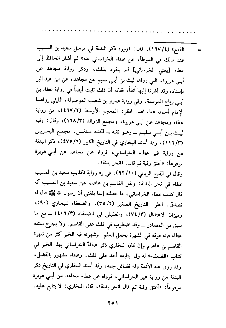 وقال في الفتح الرباني (10/ 92): في رد رواية تكذيب سعيد بن المسيب عطاء في نحو البدنة: ونقل القاسم بن عاصم عن سعيد بن المسيب أنه قال كذب عطاء الخراساني، ما حدثته إنما بلغني أن رسول الله - صلى الله عليه وسلم - قال له تصدق. انظر: التاريخ الصغير (2/ 35)، والضعفاء للبخاري (90)، وميزان الاعتدال (3/ 74)، والعقيلي في الضعفاء (3/ 406) -مع ما سبق من المصادر- وقد اضطرب في ذلك على القاسم. ولا يجرح بمثله عطاء فإنه فوقه في الشهرة بحمل العلم. وشهرته فيه الخبر أكثر من شهرة القاسم بن عاصم وإن كان البخاري ذكر عطاءٌ الخراساني بهذا الخبر في كتاب "الضعفاء" له ولم يتابعه أحد على ذلك. وعطاء مشهور بالفضل، وقد روى عنه الأئمة وله فضائل جمة، وقد أسند البخاري في التاريخ ذكر البدنة من رواية غير الخراساني، فرواه عن عطاء مجاهد عن أبي هريرة مرفوعاً: "أعتق رقبة ثم قال انحر بدنة"، قال البخاري: لا يتابع عليه. =