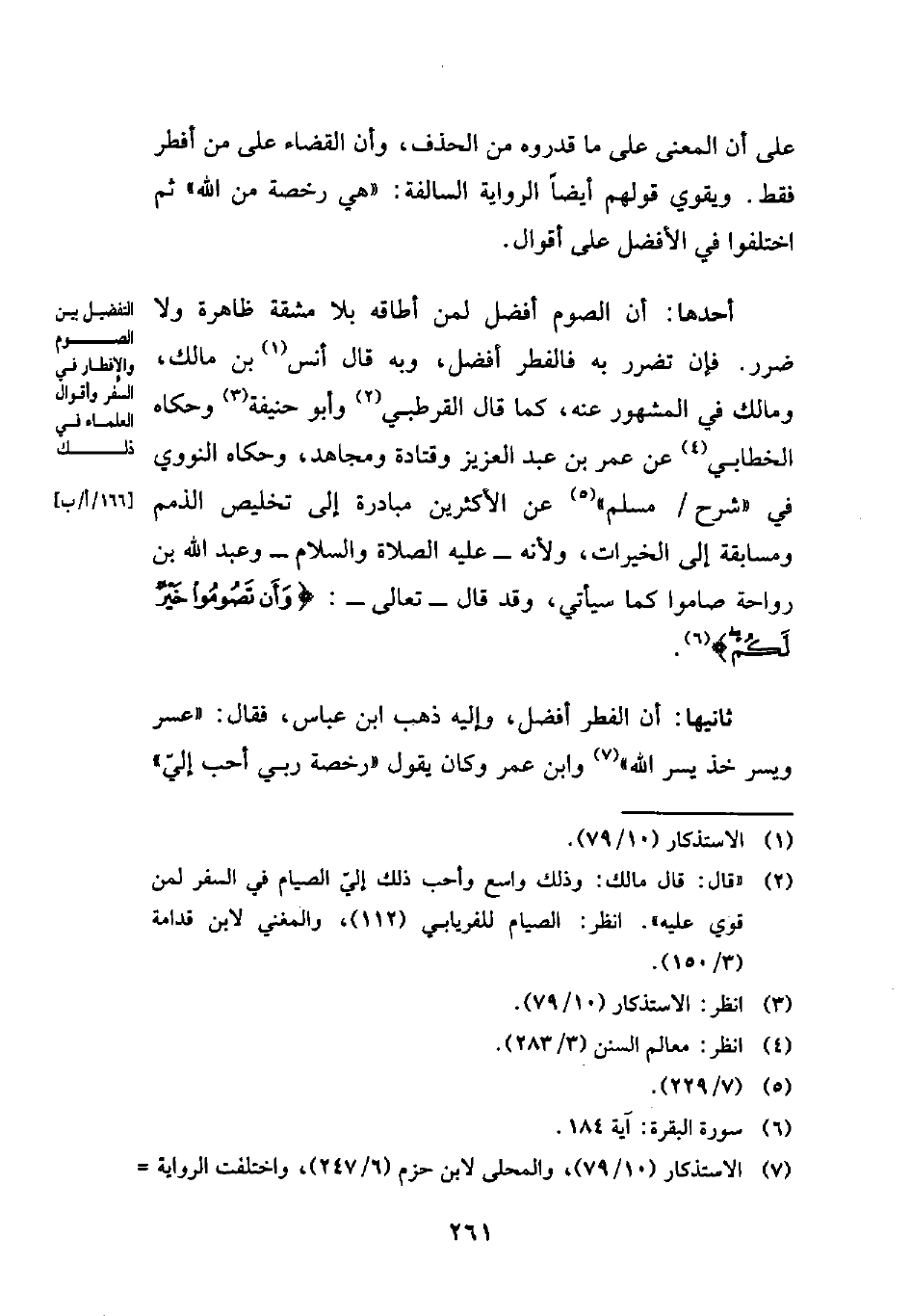 ثانيها: أن الفطر أفضل، وإليه ذهب ابن عباس، فقال: "عسر ويسر خذ يسر الله" (¬7) وابن عمر وكان يقول "رخصة ربي أحب إليّ"