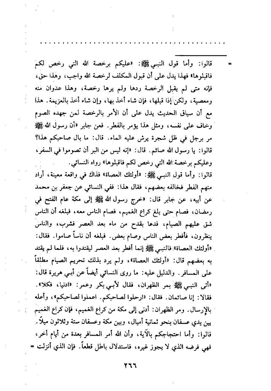 قالوا: وأما قول النبي - صلى الله عليه وسلم -: "أولئك العصاة" فذاك في واقعة معينة، أراد منهم الفطر فخالفه بعضهم، فقال هذا: ففي النسائي عن جعفر بن محمد عن أبيه، عن جابر قال: "خرج رسول الله - صلى الله عليه وسلم - إلى مكة عام الفتح في رمضان، فصام حتى بلغ كراع الغميم، فصام الناس معه، فبلغه أن الناس شق عليهم الصيام، فدعا بقدح من ماء بعد العصر فشرب، والناس ينظرون، فأفطر بعض الناس وصام بعض. فبلغه أن ناساً صاموا. فقال: "أولئك العصاة" فالنبي - صلى الله عليه وسلم - إنما أفطر بعد العصر ليقتدوا به، فلما لم يقتد به بعضهم قال: "أولئك العصاة"، ولم يرد بذلك تحريم الصيام مطلقاً على المسافر. والدليل عليه: ما روى النسائي أيضاً عن أبي هريرة قال: "أتى النبي - صلى الله عليه وسلم - بمر الظهران، فقال لأبي بكر وعمر: "ادنيا، فكلا". فقالا: إنا صائمان. فقال: "ارحلوا لصاحبكم. اعملوا لصاحبكم"، وأعله بالإِرسال. ومر الظهران: أدنى إلى مكة من كراع الغميم، فإن كراع الغميم بين يدي عسفان بنحو ثمانية أميال، وبين مكة وعسفان ستة وثلاثون ميلاً. قالوا: وأما احتجاجكم بالآية، وأن الله أمر المسافر بعدة من أيام أخر، فهي فرضه الذي لا يجوز غيره، فاستدلال باطل فطعاً. فإن الذي أنزلت =