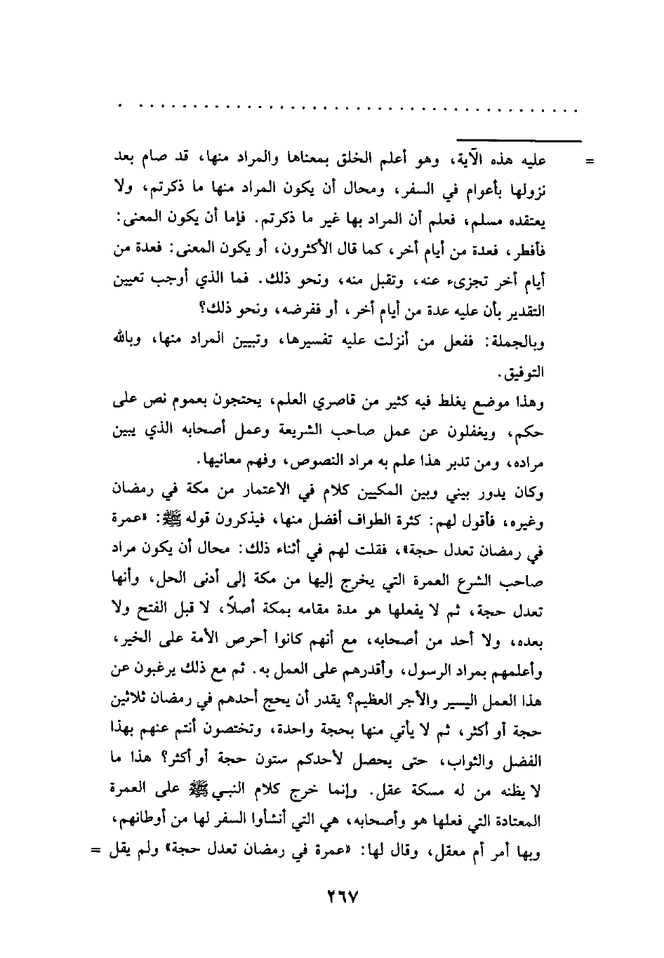 وكان يدور بيني وبين المكيين كلام في الاعتمار من مكة في رمضان وغيره، فأقول لهم: كثرة الطواف أفضل منها، فيذكرون قوله - صلى الله عليه وسلم -: "عمرة في رمضان تعدل حجة"، فقلت لهم في أثناء ذلك: محال أن يكون مراد صاحب الشرع العمرة التي يخرج إليها من مكة إلى أدنى الحل، وأنها تعدل حجة، ثم لا يفعلها هو مدة مقامه بمكة أصلاً، لا قبل الفتح ولا بعده، ولا أحد من أصحابه، مع أنهم كانوا أحرص الأمة على الخير، وأعلمهم بمراد الرسول، وأقدرهم على العمل به. ثم مع ذلك يرغبون عن هذا العمل اليسير والأجر العظيم؟ يقدر أن يحج أحدهم في رمضان ثلاثين حجة أو أكثر، ثم لا يأتي منها بحجة واحدة، وتختصون أنتم عنهم بهذا الفضل والثواب، حتى يحصل لأحدكم ستون حجة أو أكثر؟ هذا ما لا يظنه من له مسكة عقل. وإنما خرج كلام النبي - صلى الله عليه وسلم - على العمرة المعتادة التي فعلها هو وأصحابه، هي التي أنشأوا السفر لها من أوطانهم، وبها أمر أم معقل، وقال لها: "عمرة في رمضان تعدل حجة" ولم يقل =