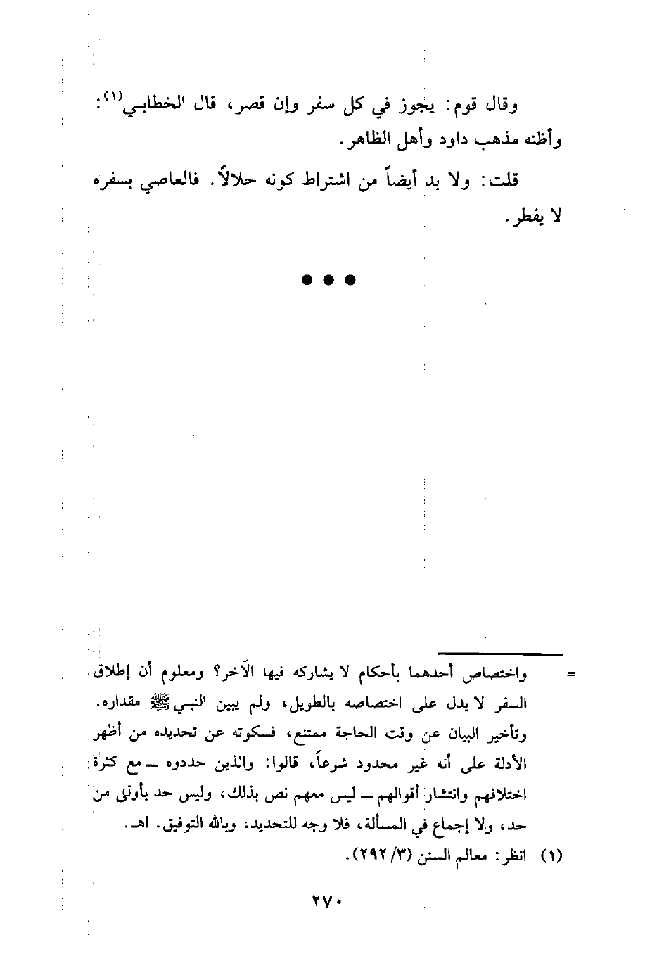 = واختصاص أحدهما بأحكام لا يشاركه فيها الآخر؟ ومعلوم أن إطلاق السفر لا يدل على اختصاصه بالطويل، ولم يبين النبي - صلى الله عليه وسلم - مقداره. وتأخير البيان عن وقت الحاجة ممتنع، فسكوته عن تحديده من أظهر الأدلة على أنه غير محدود شرعاً، قالوا: والذين حددوه -مع كثرة اختلافهم وانتشار أقوالهم- ليس معهم نص بذلك، وليس حد بأولى من حد، ولا إجماع في المسألة، فلا وجه للتحديد، وبالله التوفيق. اهـ.