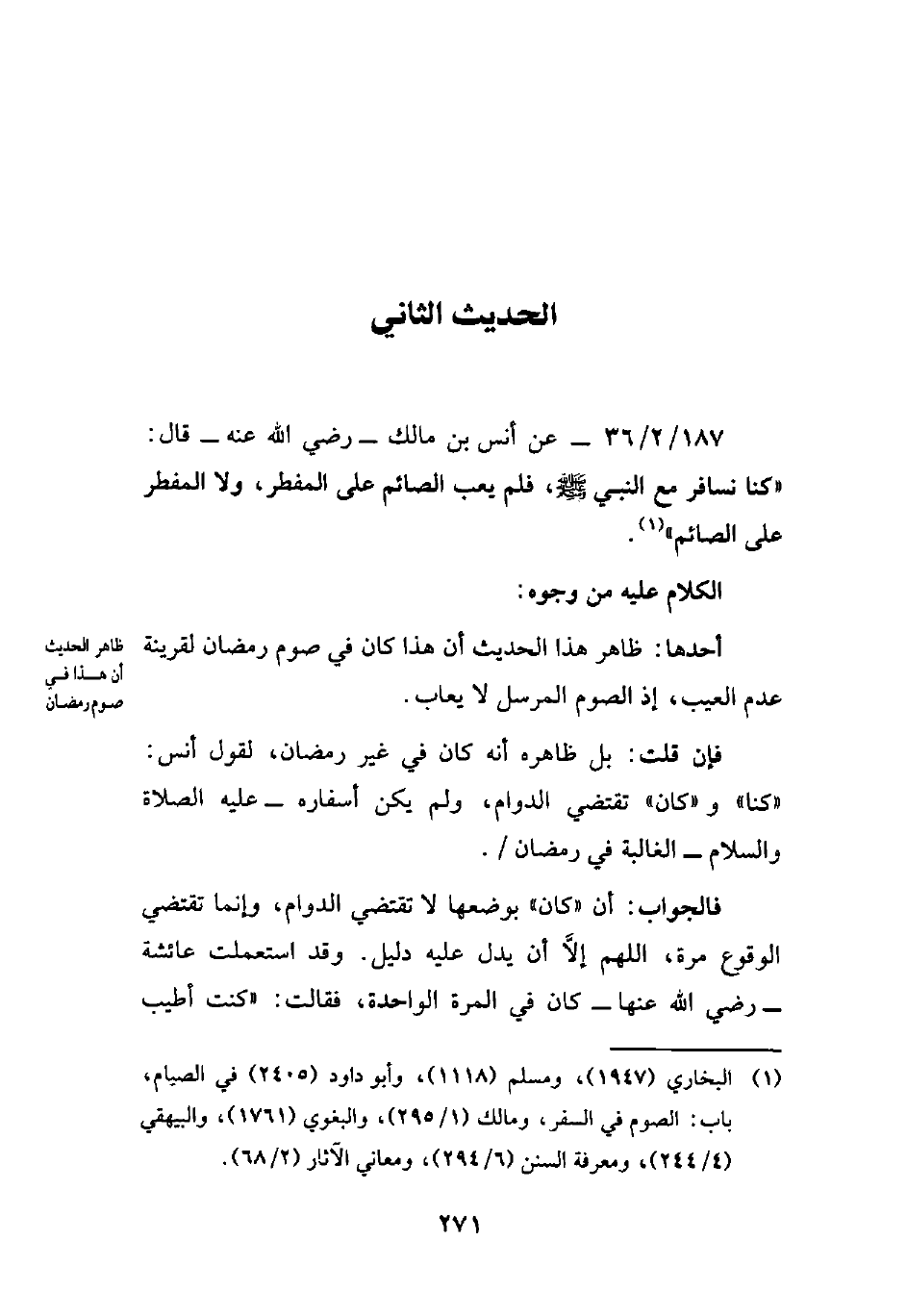 187/ 2/ 36 - عن أنس بن مالك -رضي الله عنه- قال: "كنا نسافر مع النبي - صلى الله عليه وسلم -، فلم يعب الصائم على المفطر، ولا المفطر على الصائم" (¬1).