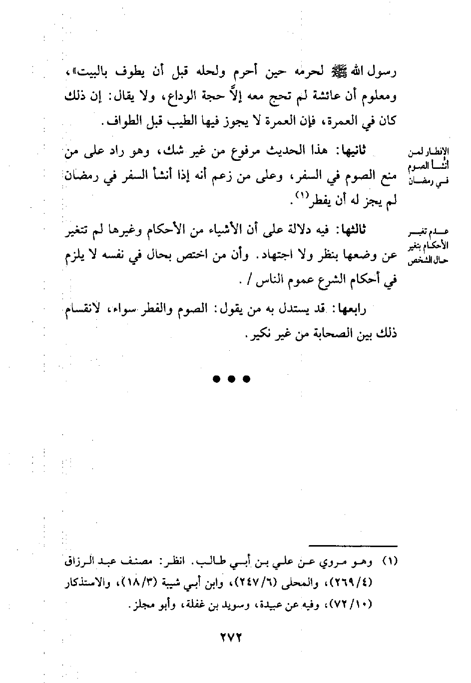 ثالثها: فيه دلالة على أن الأشياء من الأحكام وغيرها لم تتغير عن وضعها بنظر ولا اجتهاد. وأن من اختص بحال في نفسه لا يلزم في أحكام الشرع عموم الناس.