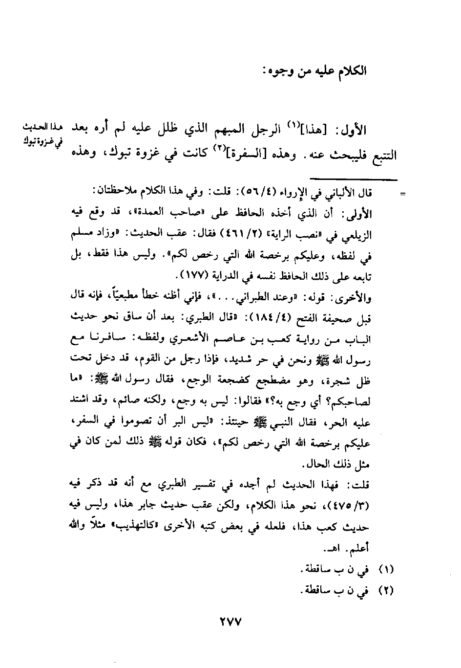 والأخرى: قوله: "وعند الطبراني ... "، فإني أظنه خطأ مطبعيّاً، فإنه قال قبل صحيفة الفتح (4/ 184): "قال الطبري: بعد أن ساق نحو حديث الباب من رواية كعب بن عاصم الأشعري ولفظه: سافرنا مع رسول الله - صلى الله عليه وسلم - ونحن في حر شديد، فإذا رجل من القوم، قد دخل تحت ظل شجرة، وهو مضطجع كضجعة الوجع، فقال رسول الله - صلى الله عليه وسلم -: "ما لصاحبكم؟ أي وجع به؟ " فقالوا: ليس به وجع، ولكنه صائم، وقد اشتد عليه الحر، فقال النبي - صلى الله عليه وسلم - حينئذ: "ليس البر أن تصوموا في السفر، عليكم برخصة الله التي رخص لكم"، فكان قوله - صلى الله عليه وسلم - ذلك لمن كان في مثل ذلك الحال.
