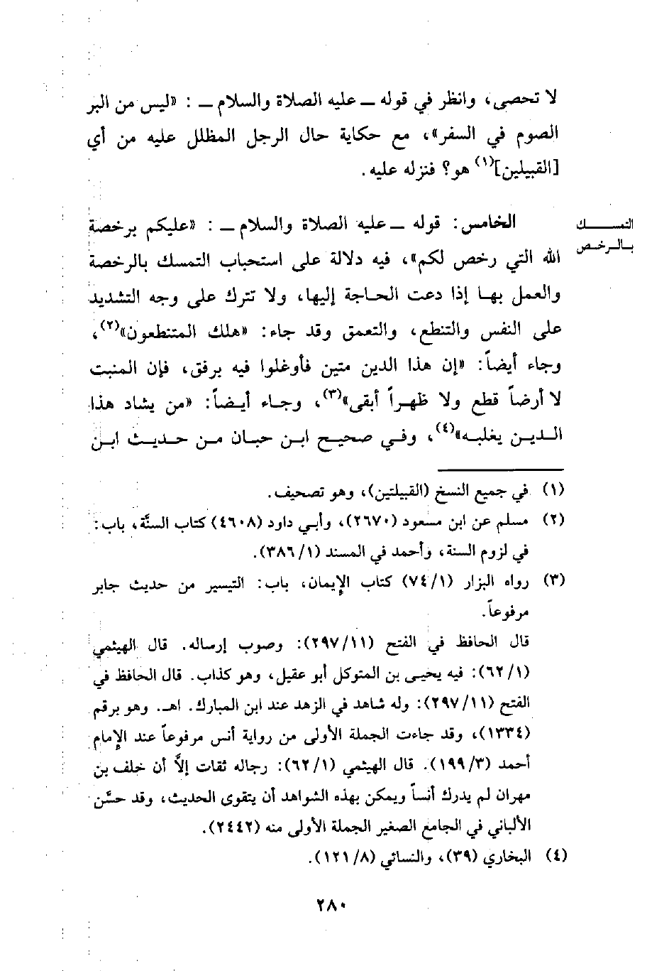 الخامس: قوله -عليه الصلاة والسلام-: "عليكم برخصة الله التي رخص لكم"، فيه دلالة على استحباب التمسك بالرخصة والعمل بها إذا دعت الحاجة إليها, ولا تترك على وجه التشديد على النفس والتنطع، والتعمق وقد جاء: "هلك المتنطعون" (¬2)، وجاء أيضاً: "إن هذا الدين متين فأوغلوا فيه برفق، فإن المنبت لا أرضاً قطع ولا ظهراً أبقى" (¬3)، وجاء أيضاً: "من يشاد هذا الدين يغلبه" (¬4)، وفي صحيح ابن حبان من حديث ابن