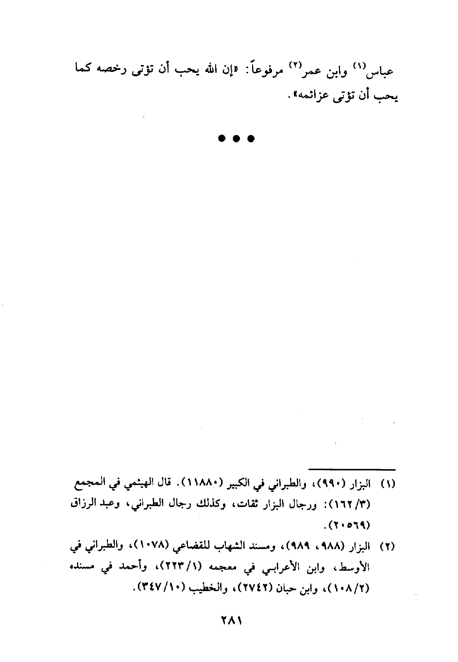 عباس (¬1) وابن عمر (¬2) مرفوعاً: "إن الله يحب أن تؤتى رخصه كما يحب أن تؤتى عزائمه".