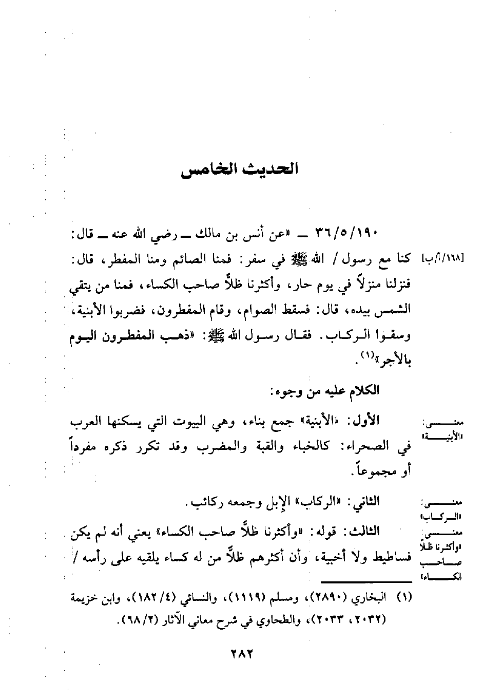 190/ 5/ 36 - " عن أنس بن مالك -رضي الله عنه- قال: كنا مع رسول الله - صلى الله عليه وسلم - في سفر: فمنا الصائم ومنا المفطر، قال: فنزلنا منزلاً في يوم حار، وأكثرنا ظلاًّ صاحب الكساء، فمنا من يتقي الشمس بيده، قال: فسقط الصوام، وقام المفطرون، فضربوا الأبنية، وسقوا الركاب. فقال رسول الله - صلى الله عليه وسلم -: "ذهب المفطرون اليوم بالأجر" (¬1).