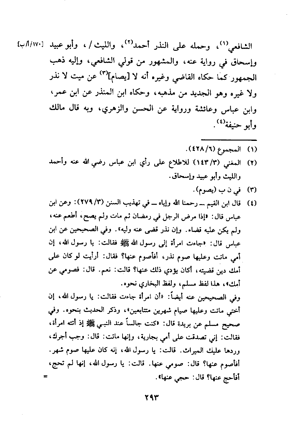 (¬4) قال ابن القيم -رحمنا الله وإياه- في تهذيب السنن (3/ 279): وعن ابن عباس قال: "إذا مرض الرجل في رمضان ثم مات ولم يصح، أطعم عنه، ولم يكن عليه قضاء. وإن نذر قضى عنه وليه". وفي الصحيحين عن ابن عباس قال: "جاءت امرأة إلى رسول الله - صلى الله عليه وسلم - فقالت: يا رسول الله، إن أمي ماتت وعليها صوم نذر، أفأصوم عنها؟ فقال: أرأيت لو كان على أمك دين قضيته، أكان يؤدي ذلك عنها؟ قالت: نعم. قال: فصومي عن أمك"، هذا لفظ مسلم، ولفظ البخاري نحوه.