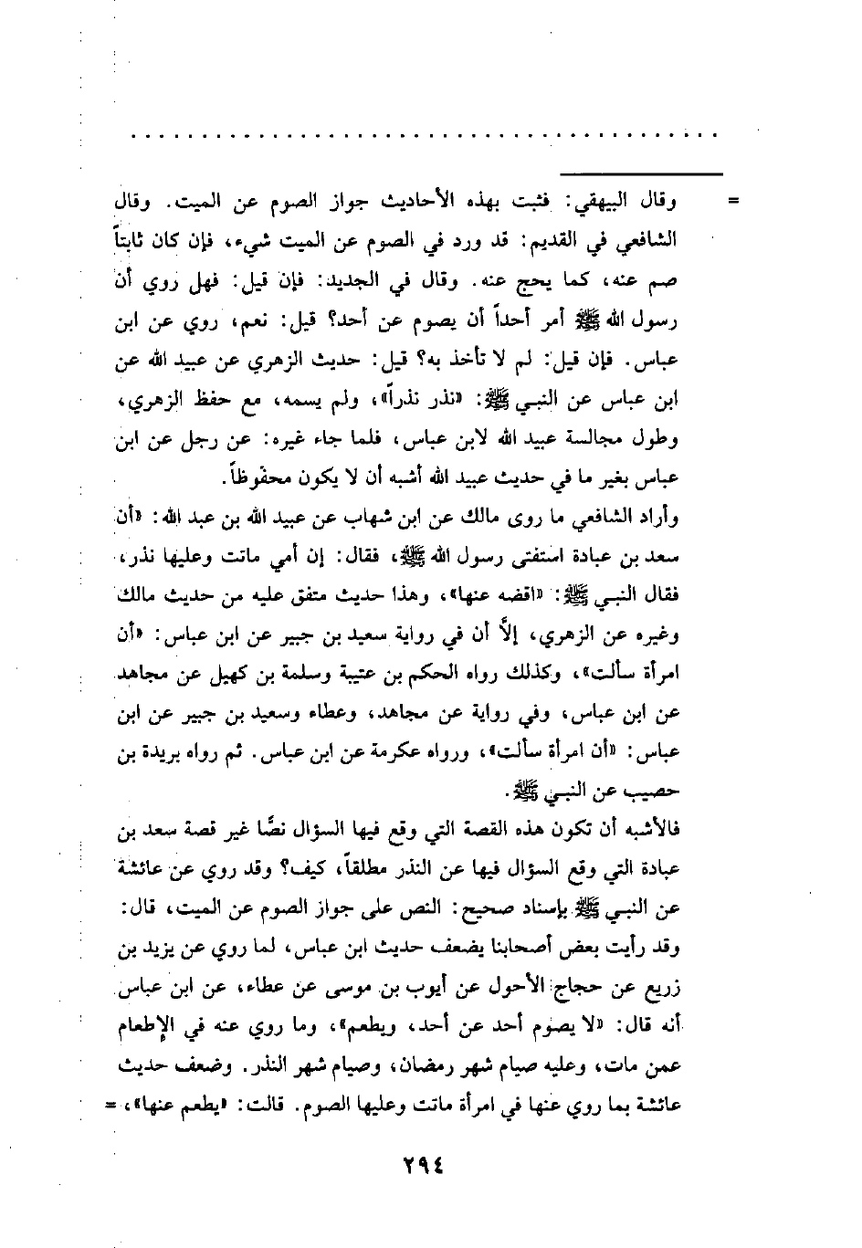 فالأشبه أن تكون هذه القصة التي وقع فيها السؤال نصًّا غير قصة سعد بن عبادة التي وقع السؤال فيها عن النذر مطلقاً، كيف؟ وقد روي عن عائشة عن النبي - صلى الله عليه وسلم - بإسناد صحيح: النص على جواز الصوم عن الميت، قال: وقد رأيت بعض أصحابنا يضعف حديث ابن عباس، لما روي عن يزيد بن زريع عن حجاج الأحول عن أيوب بن موسى عن عطاء، عن ابن عباس أنه قال: "لا يصوم أحد عن أحد، ويطعم"، وما روي عنه في الإِطعام عمن مات، وعليه صيام شهر رمضان، وصيام شهر النذر. وضعف حديث عائشة بما روي عنها في امرأة ماتت وعليها الصوم. قالت: "يطعم عنها"، =