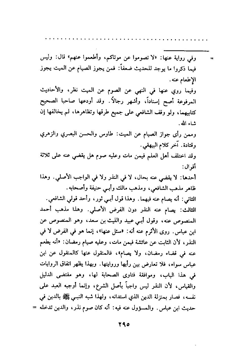 وفيما روي عنها في النهي عن الصوم عن الميت نظر، والأحاديث المرفوعة أصح إسناداً، وأشهر رجالاً. وقد أودعها صاحبا الصحيح كتابيهما, ولو وقف الشافعي على جميع طرقها وتظاهرها, لم يخالفها إن شاء الله.