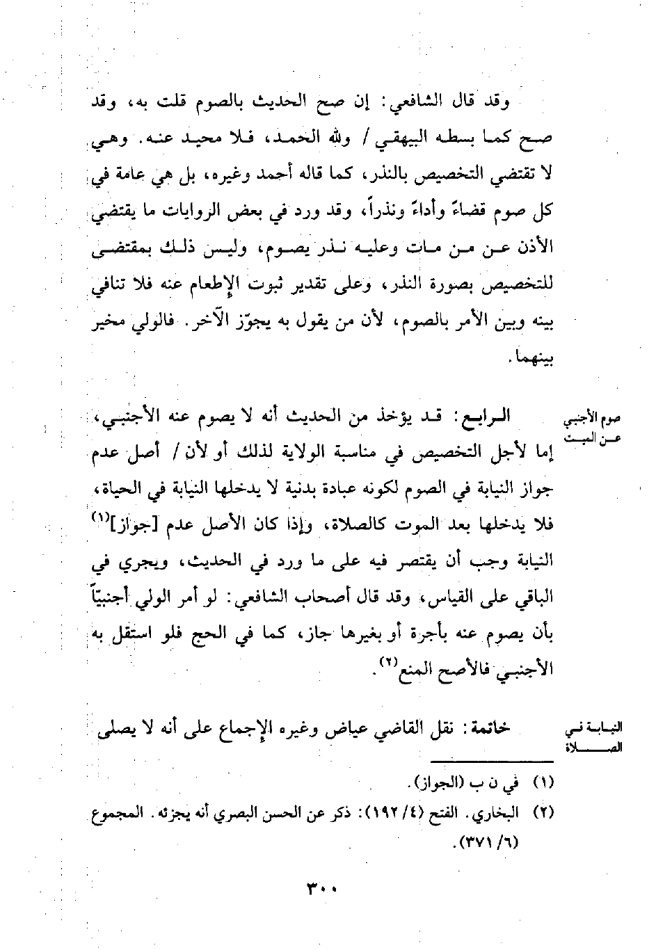 الرابع: قد يؤخذ من الحديث أنه لا يصوم عنه الأجنبي، إما لأجل التخصيص في مناسبة الولاية لذلك أو لأن أصل عدم جواز النيابة في الصوم لكونه عبادة بدنية لا يدخلها النيابة في الحياة، فلا يدخلها بعد الموت كالصلاة، وإذا كان الأصل عدم [جواز] (¬1) النيابة وجب أن يقتصر فيه على ما ورد في الحديث، ويجري في الباقي على العباس، وقد قال أصحاب الشافعي: لو أمر الولي أجنبيّاً بأن يصوم عنه بأجرة أو بغيرها جاز، كما في الحج فلو استقل به الأجنبي فالأصح المنع (¬2).