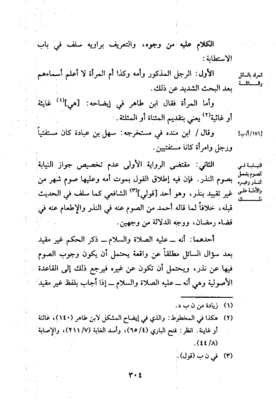 أحدهما: أنه -عليه الصلاة والسلام- ذكر الحكم غير مقيد بعد سؤال السائل مطلقاً عن واقعة يحتمل أن يكون وجوب الصوم فيها عن نذر, ويحتمل أن تكون عن غيره فيرجع ذلك إلى القاعدة الأصولية وهي أنه -عليه الصلاة والسلام- إذا أجاب بلفظ غير مقيد