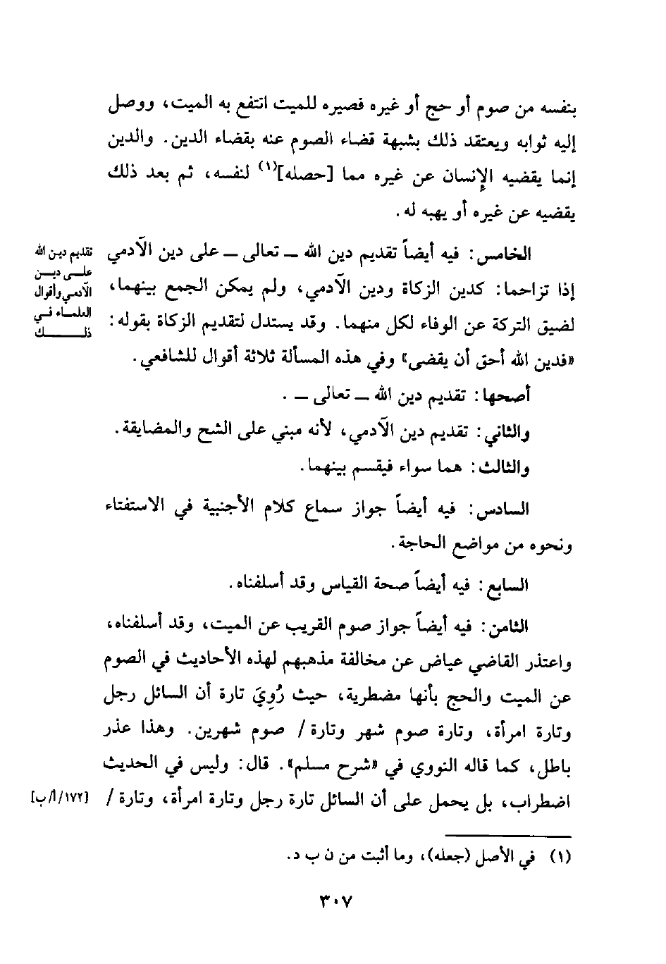 الخامس: فيه أيضاً تقديم دين الله -تعالى- على دين الآدمي إذا تزاحما: كدين الزكاة ودين الآدمي، ولم يمكن الجمع بينهما، لضيق التركة عن الوفاء لكل منهما. وقد يستدل لتقديم الزكاة بقوله: "فدين الله أحق أن يقضى" وفي هذه المسألة ثلاثة أقوال للشافعي.