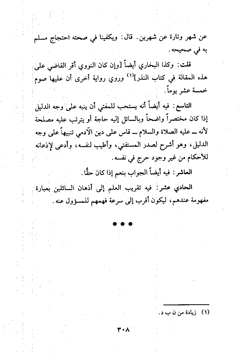 التاسع: فيه أيضاً أنه يستحب للمفتي أن ينبه على وجه الدليل إذا كان مختصراً واضحاً وبالسائل إليه حاجة أو يترتب عليه مصلحة لأنه -عليه الصلاة والسلام- قاس على دين الآدمي تنبيهاً على وجه الدليل، وهو أشرح لصدر المستفتي، وأطيب لنفسه، وأدعى لإِذعانه للأحكام من غير وجود حرج في نفسه.