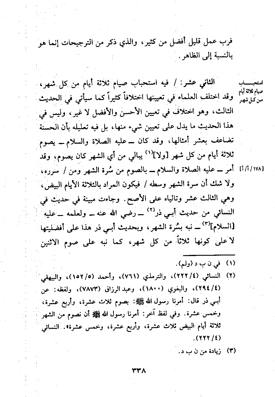 الثاني عشر: فيه استحباب صيام ثلاثة أيام من كل شهر، وقد اختلف العلماء في تعيينها اختلافاً كثيراً كما سيأتي في الحديث الثالث، وهو اختلاف في تعيين الأحسن والأفضل لا غير، وليس في هذا الحديث ما يدل على تعيين شيء منها، بل فيه تعليله بأن الحسنة تضاعف بعشر أمثالها، وقد كان -عليه الصلاة والسلام- يصوم ثلاثة أيام من كل شهر [ولا] (¬1) يبالي من أي الشهر كان يصوم، وقد أمر -عليه الصلاة والسلام- بالصوم من سُرة الشهر ومن سرره، ولا شك أن سرة الشهر وسطه فيكون المراد بالثلاثة الأيام البيض، وهي الثالث عشر وتالياه على الأصح. وجاءت مبينة في حديث في النسائي من حديث أبي ذر (¬2) -رضي الله عنه- ولعلمه -عليه [السلام] (¬3) - نبه بسُرة الشهر، وبحديث أبي ذر هذا على أفضليتها لا على كونها ثلاثاً من كل شهر، كما نبه على صوم الاثنين