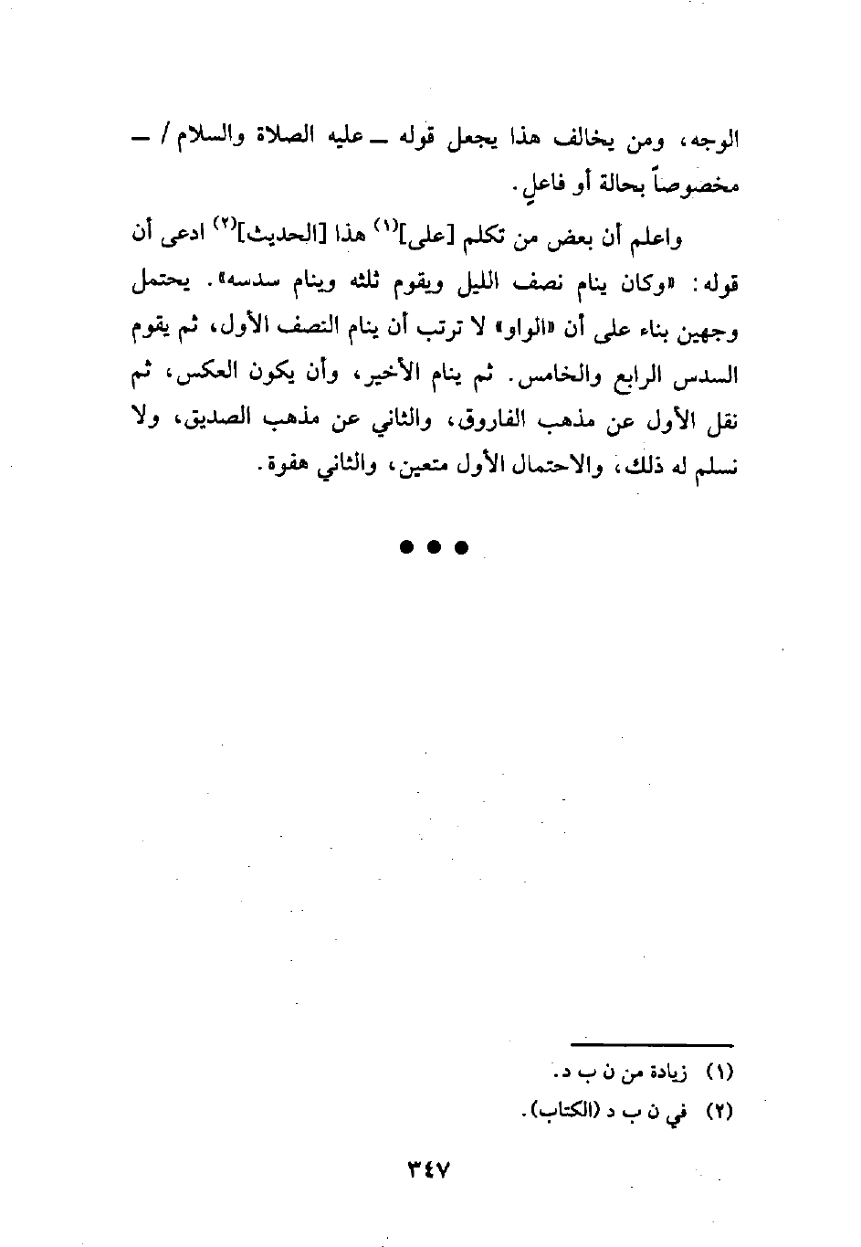 واعلم أن بعض من تكلم [على] (¬1) هذا [الحديث] (¬2) ادعى أن قوله: "وكان ينام نصف الليل ويقوم ثلثه وينام سدسه". يحتمل وجهين بناء على أن "الواو" لا ترتب أن ينام النصف الأول، ثم يقوم السدس الرابع والخامس. ثم ينام الأخير، وأن يكون العكس، ثم نقل الأول عن مذهب الفاروق، والثاني عن مذهب الصديق، ولا نسلم له ذلك، والاحتمال الأول متعين، والثاني هفوة.