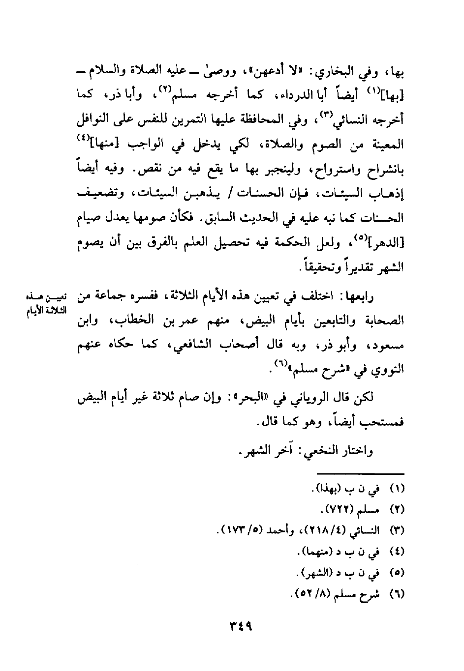 رابعها: اختلف في تعيين هذه الأيام الثلاثة، ففسره جماعة من الصحابة والتابعين بأيام البيض، منهم عمر بن الخطاب، وابن مسعود، وأبو ذر، وبه قال أصحاب الشافعي، كما حكاه عنهم النووي في "شرح مسلم" (¬6).