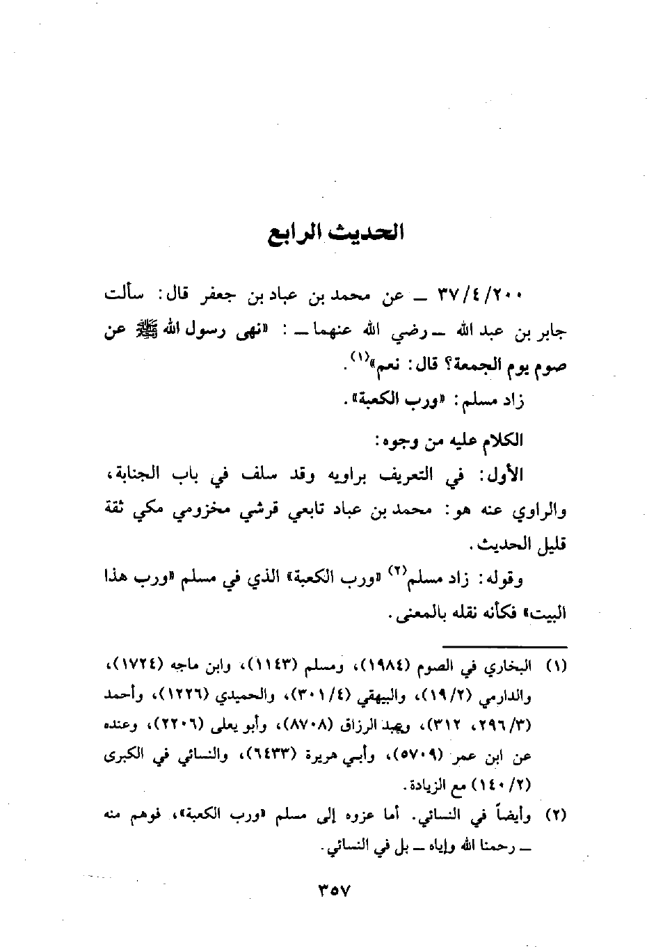 200/ 4/ 37 - عن محمد بن عباد بن جعفر قال: سألت جابر بن عبد الله -رضي الله عنهما-: "نهى رسول الله - صلى الله عليه وسلم - عن صوم يوم الجمعة؟ قال: نعم" (¬1).