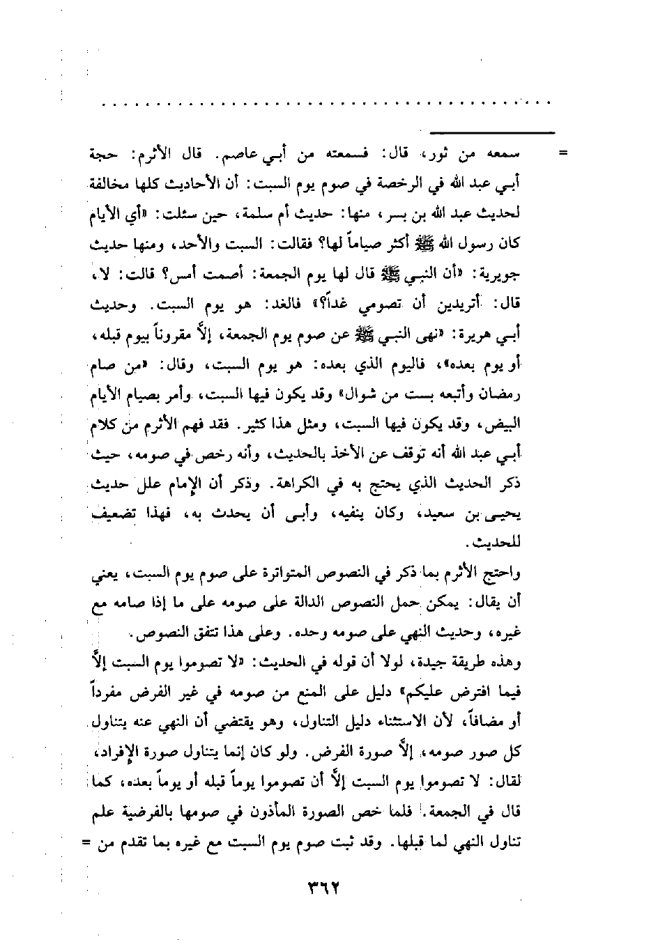 = سمعه من ثور، قال: فسمعته من أبي عاصم. قال الأثرم: حجة أبي عبد الله في الرخصة في صوم يوم السبت: أن الأحاديث كلها مخالفة لحديث عبد الله بن بسر، منها: حديث أم سلمة، حين سئلت: "أي الأيام كان رسول الله - صلى الله عليه وسلم - أكثر صياماً لها؟ فقالت: السبت والأحد، ومنها حديث جويرية: "أن النبي - صلى الله عليه وسلم - قال لها يوم الجمعة: أصمت أمس؟ قالت: لا، قال: أتريدين أن تصومي غداً؟ " فالغد: هو يوم السبت. وحديث أبي هريرة: "نهى النبي - صلى الله عليه وسلم - عن صوم يوم الجمعة، إلاَّ مقروناً بيوم قبله، أو يوم بعده"، فاليوم الذي بعده: هو يوم السبت، وقال: "من صام رمضان وأتبعه بست من شوال" وقد يكون فيها السبت، وأمر بصيام الأيام البيض، وقد يكون فيها السبت، ومثل هذا كثير. فقد فهم الأثرم من كلام أبي عبد الله أنه توقف عن الأخذ بالحديث، وأنه رخص في صومه، حيث ذكر الحديث الذي يحتج به في الكراهة. وذكر أن الإِمام علل حديث يحيى بن سعيد، وكان ينفيه، وأبى أن يحدث به، فهذا تضعيف للحديث.