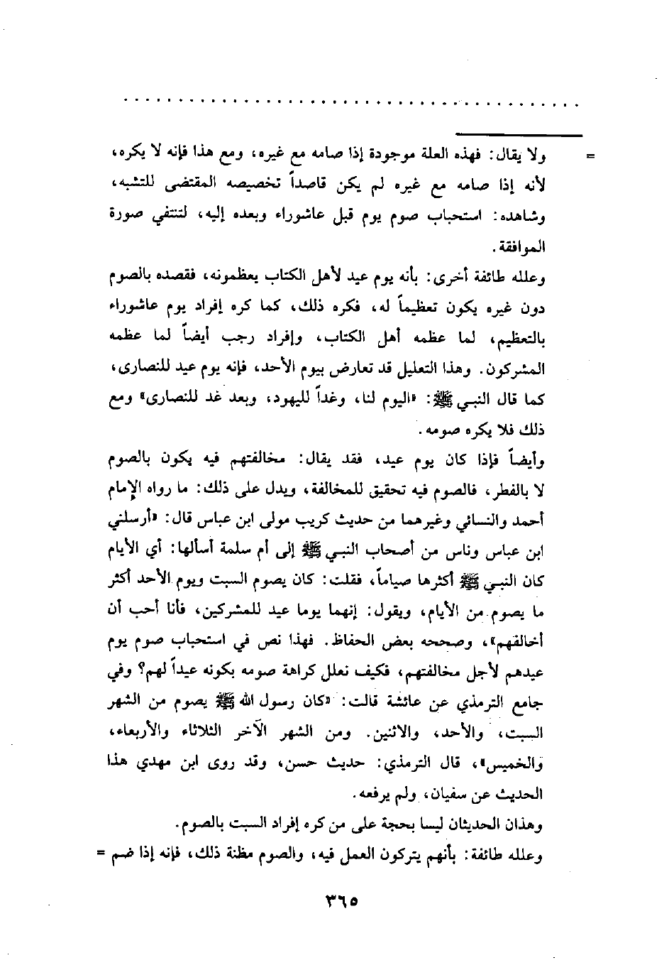 = ولا يقال: فهذه العلة موجودة إذا صامه مع غيره، ومع هذا فإنه لا يكره، لأنه إذا صامه مع غيره لم يكن قاصداً تخصيصه المقتضى للتشبه، وشاهده: استحباب صوم يوم قبل عاشوراء وبعده إليه، لتنتفي صورة الموافقة.