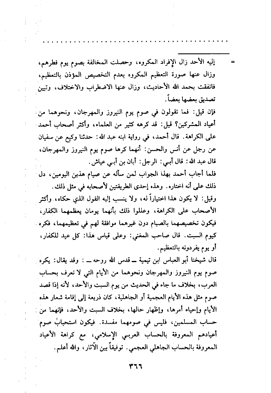 قال شيخنا أبو العباس ابن تيمية -قدس الله روحه-: وقد يقال: يكره صوم يوم النيروز والمهرجان ونحوهما من الأيام التي لا تعرف بحساب العرب، بخلاف ما جاء في الحديث من يوم السبت والأحد، لأنه إذا قصد صوم مثل هذه الأيام العجمية أو الجاهلية، كان ذريعة إلى إقامة شعار هذه الأيام وإحياء أمرها، وإظهار حالها، بخلاف السبت والأحد، فإنهما من حساب المسلمين، فليس في صومهما مفسدة. فيكون استحباب صوم أعيادهم المعروفة بالحساب العربي الإِسلامي، مع كراهة الأعياد المعروفة بالحساب الجاهلي العجمي. توفيقاً بين الآثار، والله أعلم.
