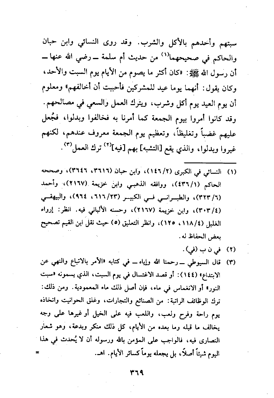 سبتهم وأحدهم بالأكل والشرب. وقد روى النسائي وابن حبان والحاكم في صحيحهما (¬1) من حديث أم سلمة -رضي الله عنها- أن رسول الله - صلى الله عليه وسلم -: "كان أكثر ما يصوم من الأيام يوم السبت والأحد، وكان يقول: أنهما يوما عيد للمشركين فأحببت أن أخالفهم" ومعلوم أن يوم العيد يوم أكل وشرب، ويترك العمل والسعي في مصالحهم. وقد كانوا أمروا بيوم الجمعة كما أمرنا به فخالفوا وبدلوا، فجُعل عليهم غضباً وتغليظاً، وتعظيم يوم الجمعة معروف عندهم، لكنهم غيروا وبدلوا، والذي يقع [التشبه] بهم [فيه] (¬2) ترك العمل (¬3).