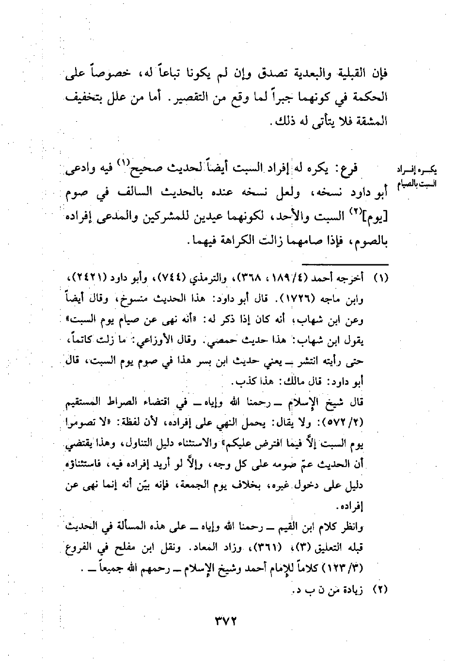 وانظر كلام ابن القيم -رحمنا الله وإياه- على هذه المسألة في الحديث قبله التعليق (3)، (361)، وزاد المعاد. ونقل ابن مفلح في الفروع (3/ 123) كلاماً للإِمام أحمد وشيخ الإِسلام -رحمهم الله جميعاً-.