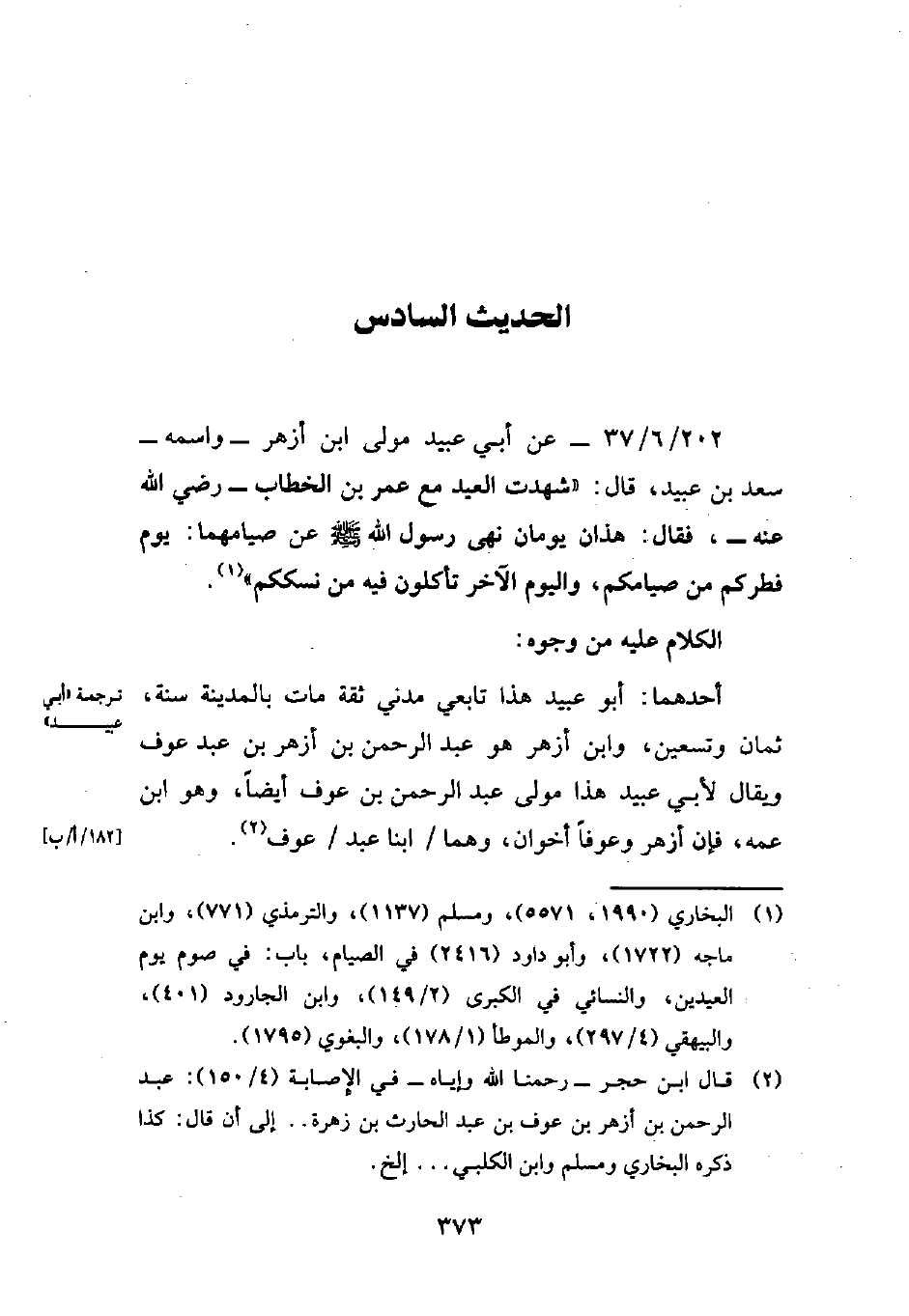 202/ 6/ 37 - عن أبي عبيد مولى ابن أزهر -واسمه- سعد بن عبيد، قال: "شهدت العيد مع عمر بن الخطاب -رضي الله عنه-، فقال: هذان يومان نهى رسول الله - صلى الله عليه وسلم - عن صيامهما: يوم فطركم من صيامكم، واليوم الآخر تأكلون فيه من نسككم" (¬1).