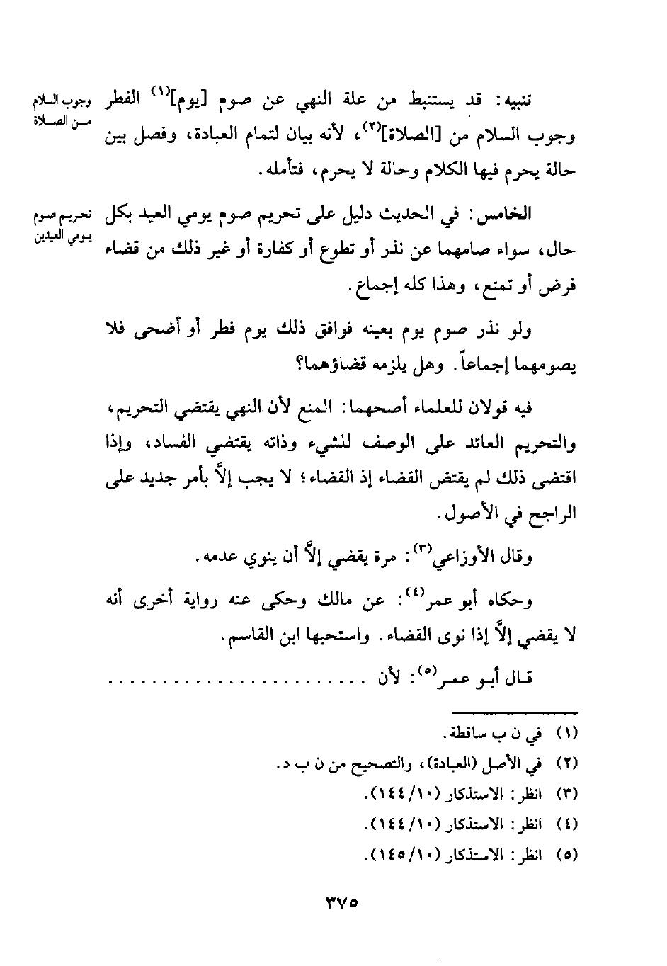 تنبيه: قد يستنبط من علة النهي عن صوم [يوم] (¬1) الفطر وجوب السلام من [الصلاة] (¬2)، لأنه بيان لتمام العبادة، وفصل بين حالة يحرم فيها الكلام وحالة لا يحرم، فتأمله.