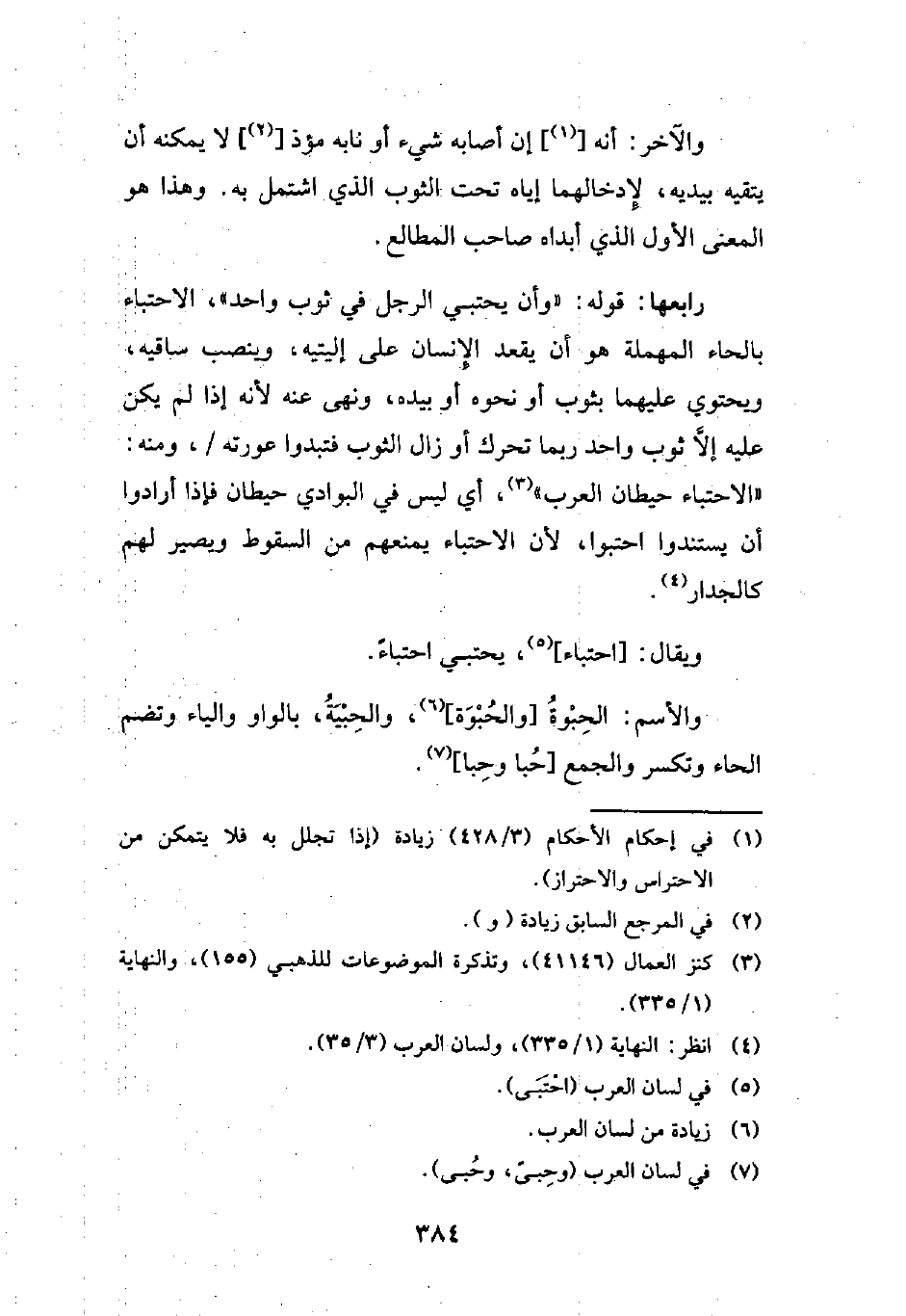 رابعها: قوله: "وأن يحتبي الرجل في ثوب واحد"، الاحتباء بالحاء المهملة هو أن يقعد الإِنسان على إليتيه، وينصب ساقيه، ويحتوي عليهما بثوب أو نحوه أو بيده، ونهى عنه لأنه إذا لم يكن عليه إلاَّ ثوب واحد ربما تحرك أو زال الثوب فتبدوا عورته، ومنه: "الاحتباء حيطان العرب" (¬3)، أي ليس في البوادي حيطان فإذا أرادوا أن يستندوا احتبوا، لأن الاحتباء يمنعهم من السقوط ويصير لهم كالجدار (¬4).