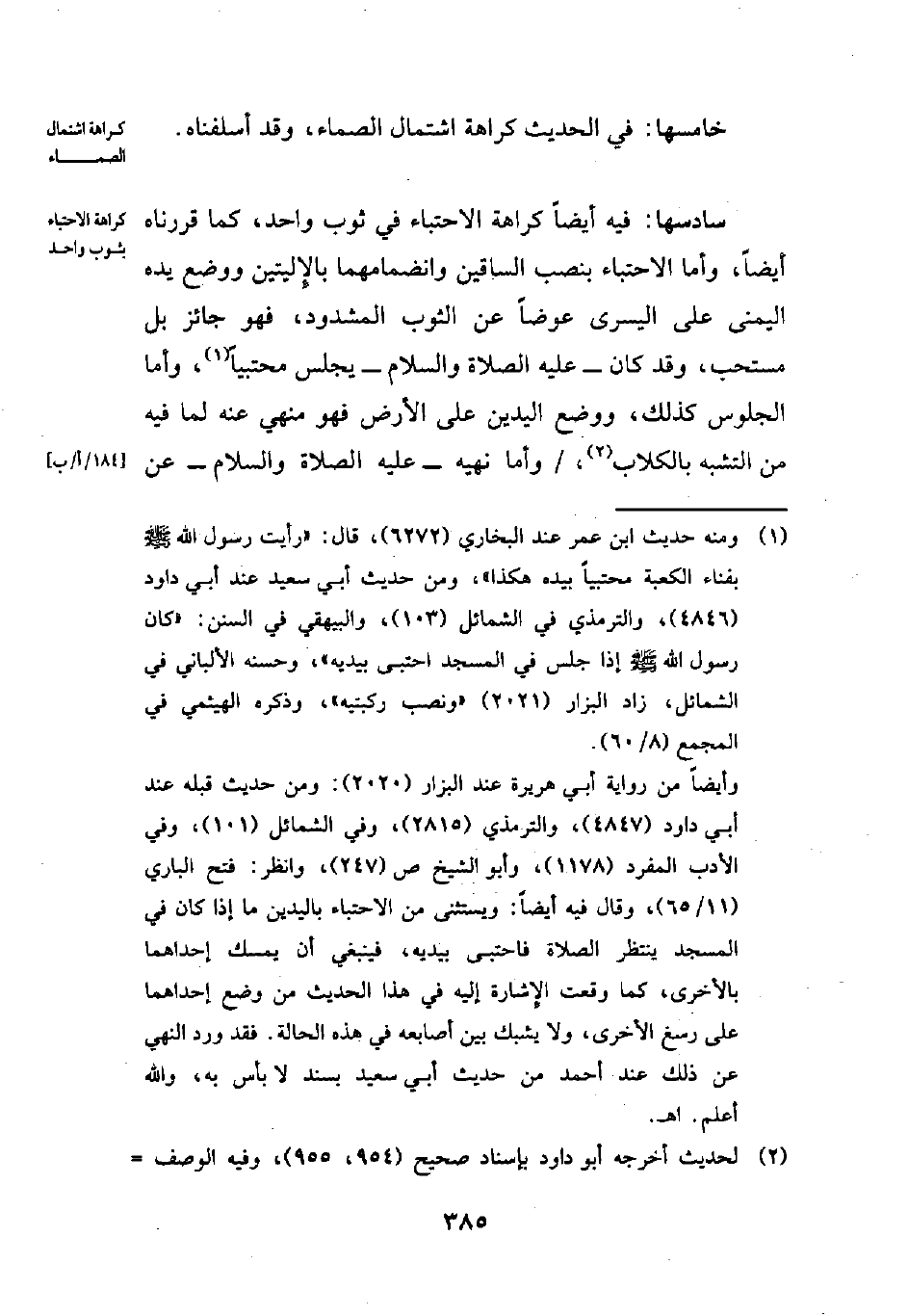 سادسها: فيه أيضاً كراهة الاحتباء في ثوب واحد، كما قررناه أيضاً، وأما الاحتباء بنصب الساقين وانضمامهما بالإِليتين ووضع يده اليمنى على اليسرى عوضاً عن الثوب المشدود، فهو جائز بل مستحب، وقد كان -عليه الصلاة والسلام- يجلس محتبياً (¬1)، وأما الجلوس كذلك، ووضح اليدين على الأرض فهو منهي عنه لما فيه من التشبه بالكلاب (¬2)، وأما نهيه -عليه الصلاة والسلام- عن